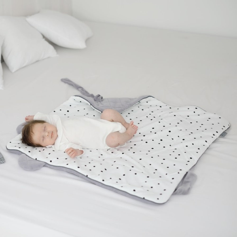 Ein multifunktionales Produkt, das sowohl als Hütchen, als auch als Spielmatte und sogar als Notfall-Wickeltisch funktioniert.