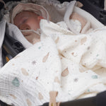 Der zarte Musselin-Stoff, der für seine außergewöhnliche Leichtigkeit und angenehme Textur bekannt ist, macht die Decke perfekt zum Kuscheln mit dem Baby, zum Zudecken im Kinderwagen bei Spaziergängen oder als dekoratives Accessoire im Babyzimmer.