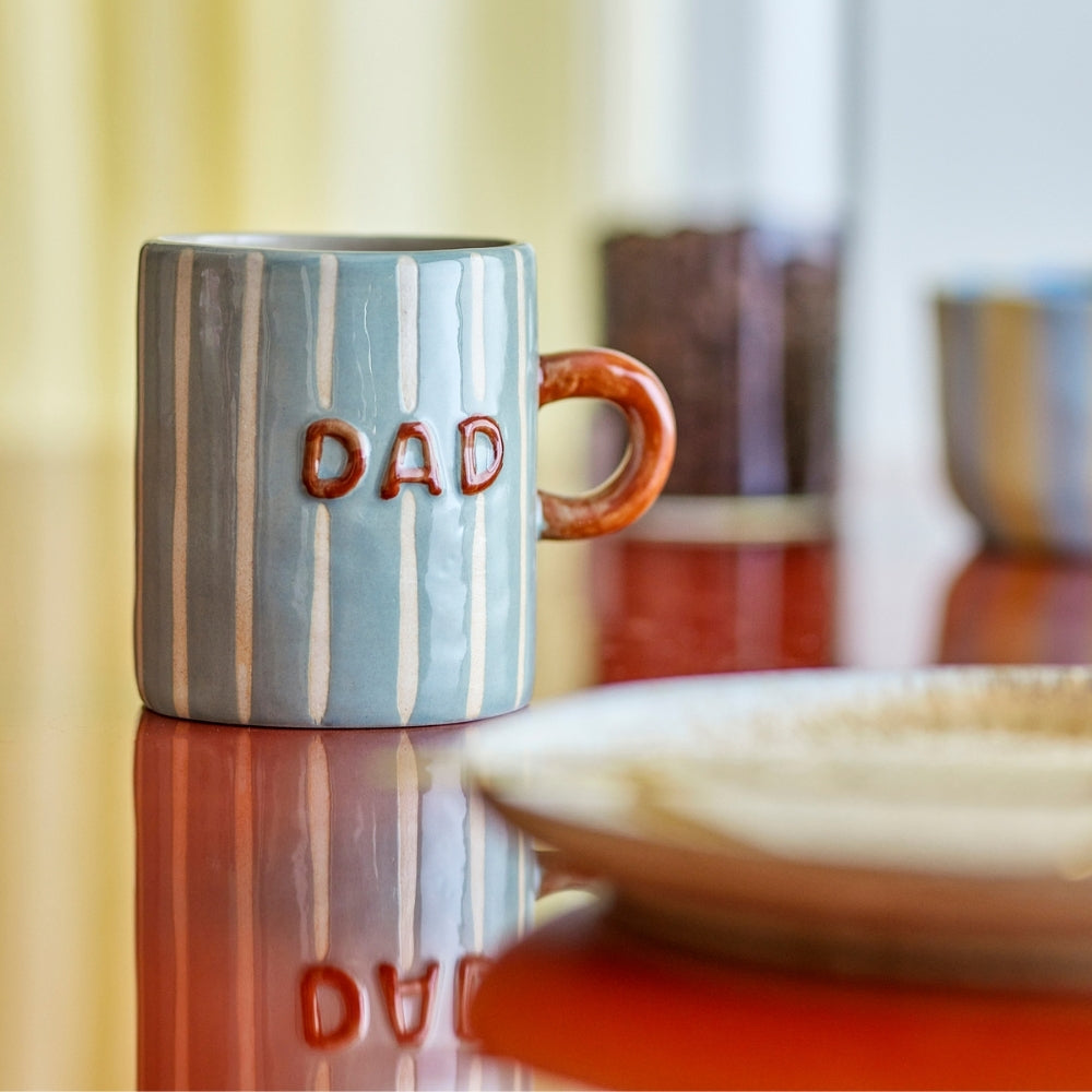 Die vertikalen cremefarbenen Streifen, der kontrastierende terrakottafarbene Henkel und die Aufschrift "DAD" auf beiden Seiten verleihen ihm eine warme, persönliche Note und machen ihn zu einem perfekten Geschenk.