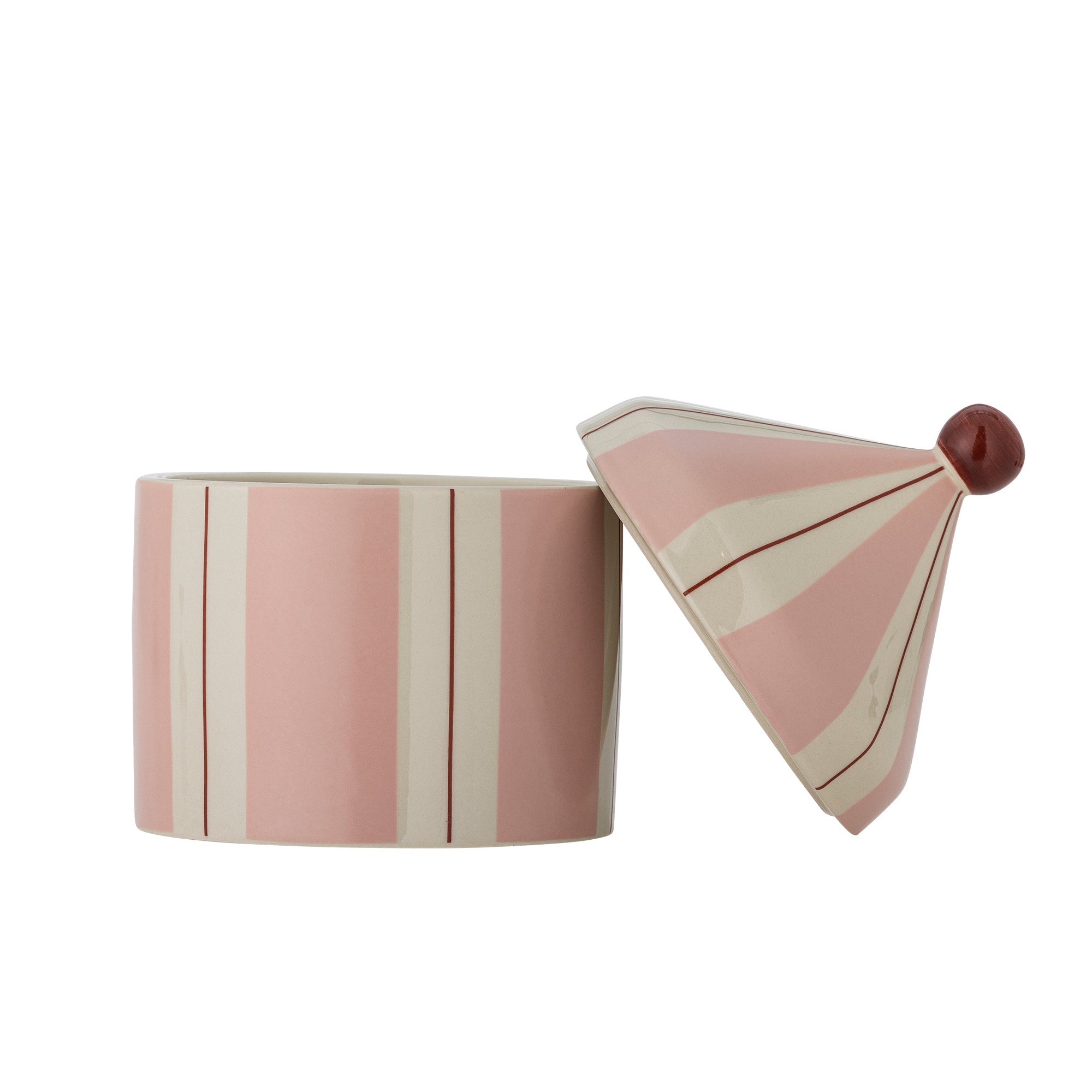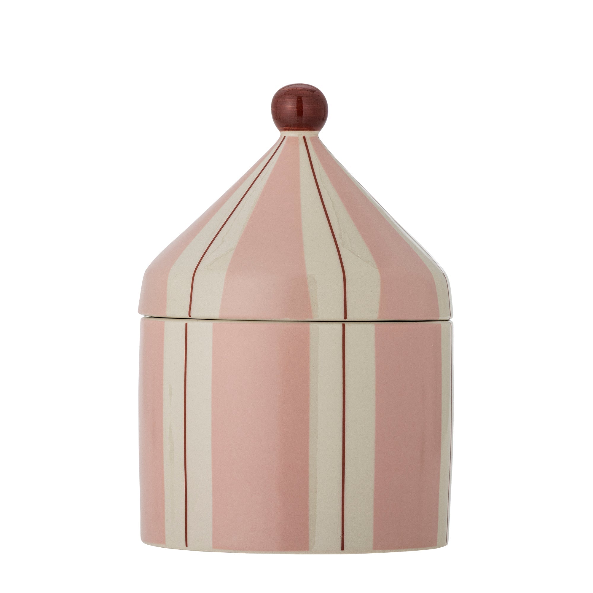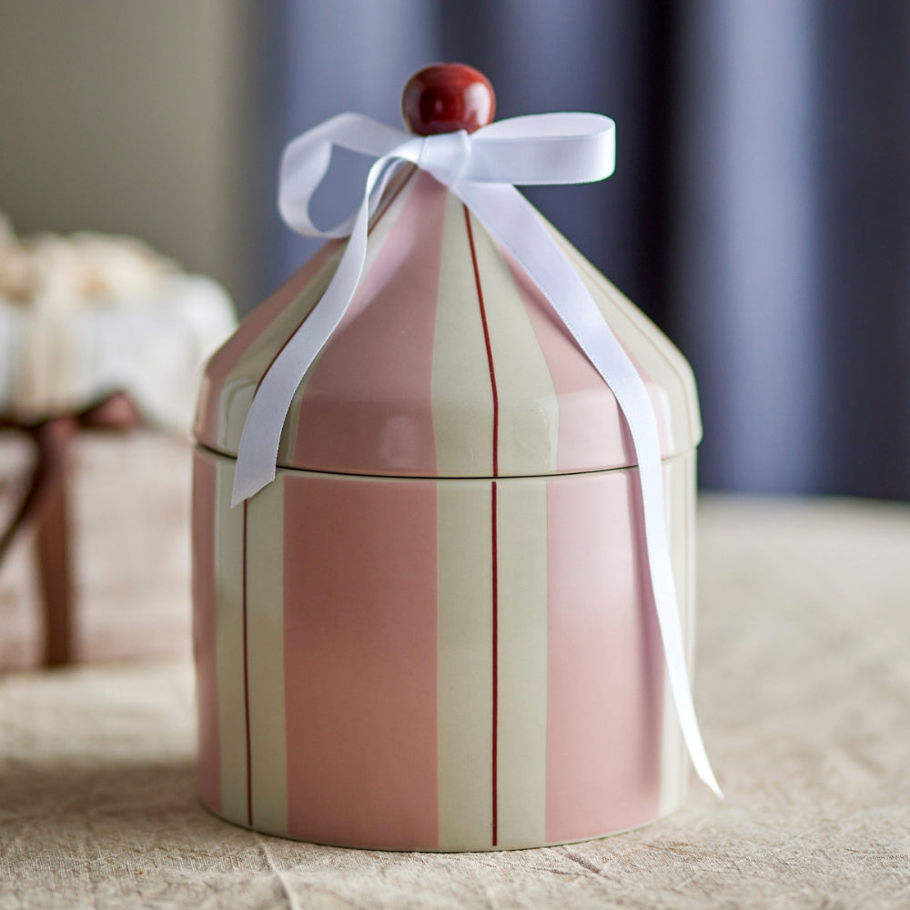 Der Aufbewahrungsbehälter hat die niedliche Form eines Zirkuszeltes und ist aus Steingut mit blauen und weißen Streifen gefertigt.
