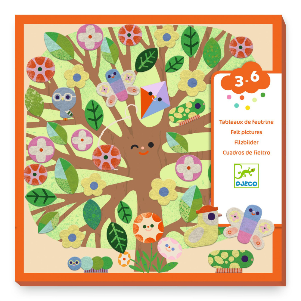 Das Kunstset von Djeco entführt das Kind in die Natur mit Filzstickern, mit denen es die Baumabbildungen verzieren kann.