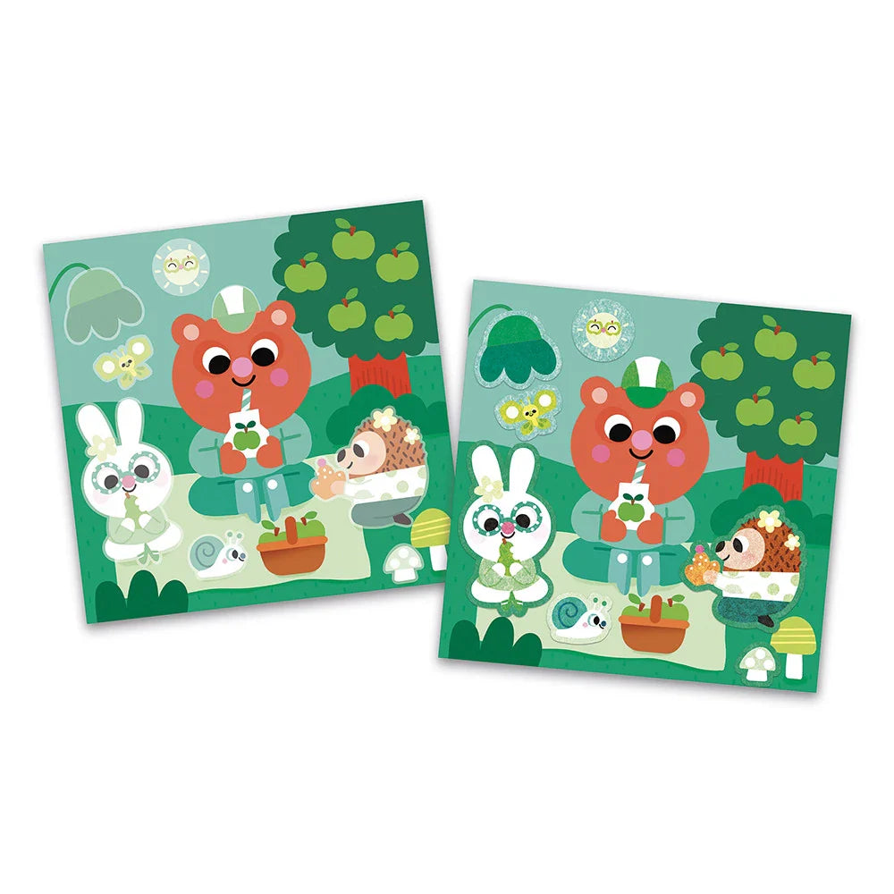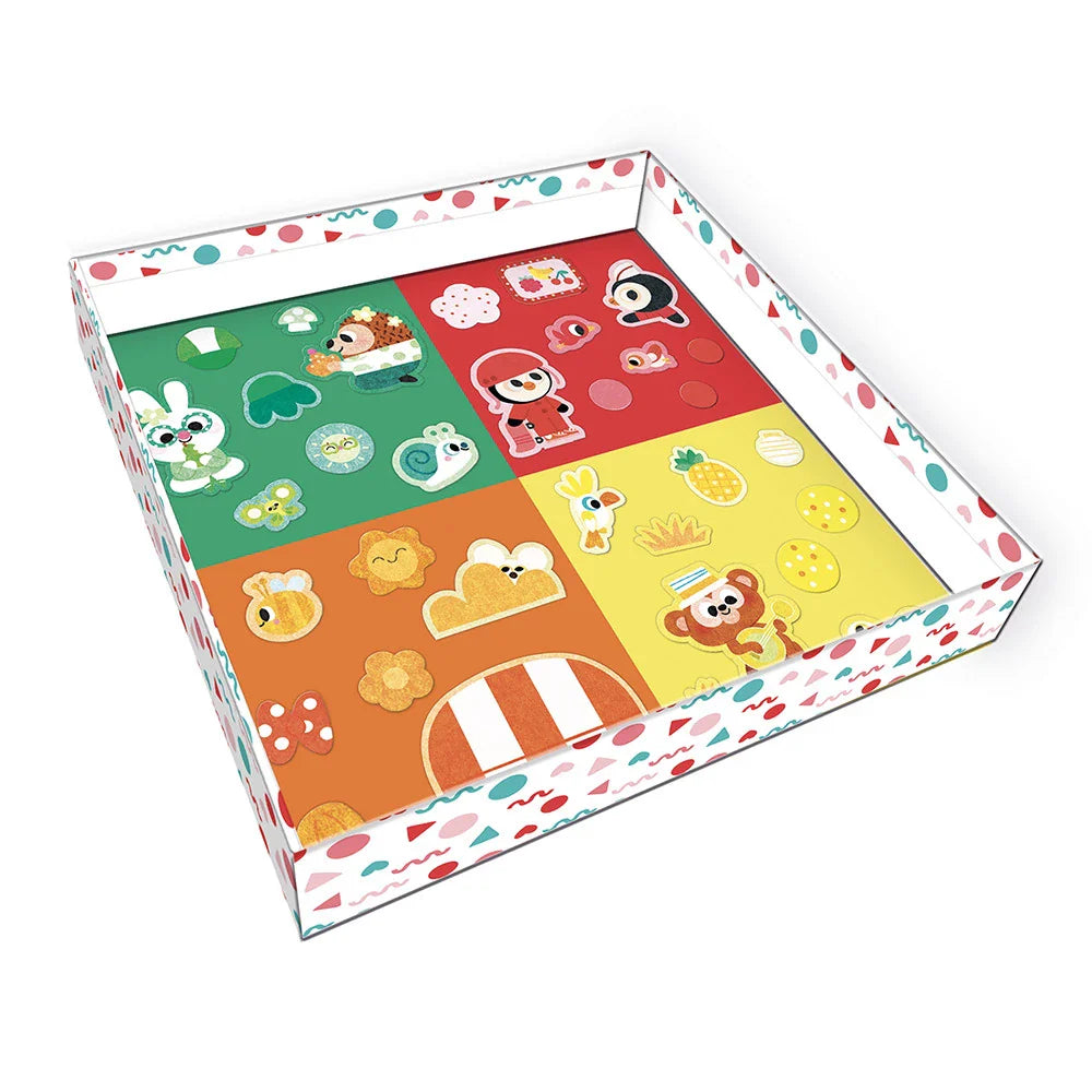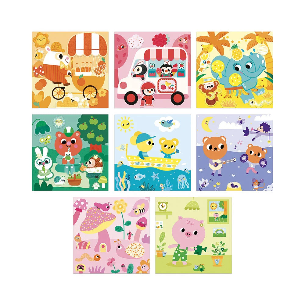 Mit diesem Janod Kreativset können Kleinkinder vier Bilder mit den runden Schaumstoffmosaiken dekorieren und so auffällige und farbenfrohe Illustrationen schaffen.