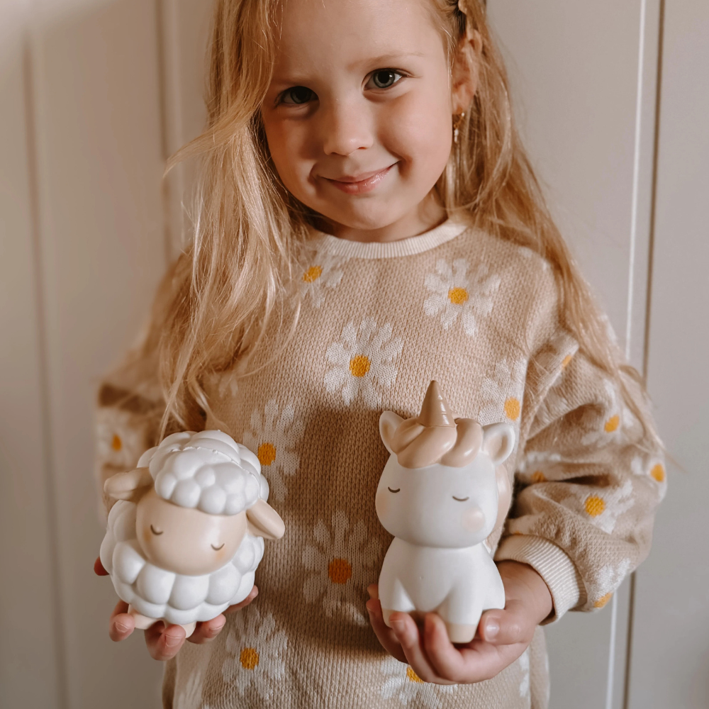 Die Frau Ertha-Kollektion umfasst vier niedliche Figuren: ein Schaf, ein Einhorn, einen Igel und einen Hasen.