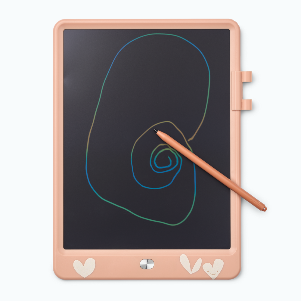 Der LCD-Bildschirm reagiert auf den Stift, und mit einer einzigen Taste auf der Vorderseite kann der Bildschirm gelöscht werden; mit einem Sperrschieber auf der Rückseite können Sie das Bild sichern, damit Ihr Kind weiterzeichnen kann, ohne versehentlich zu löschen.