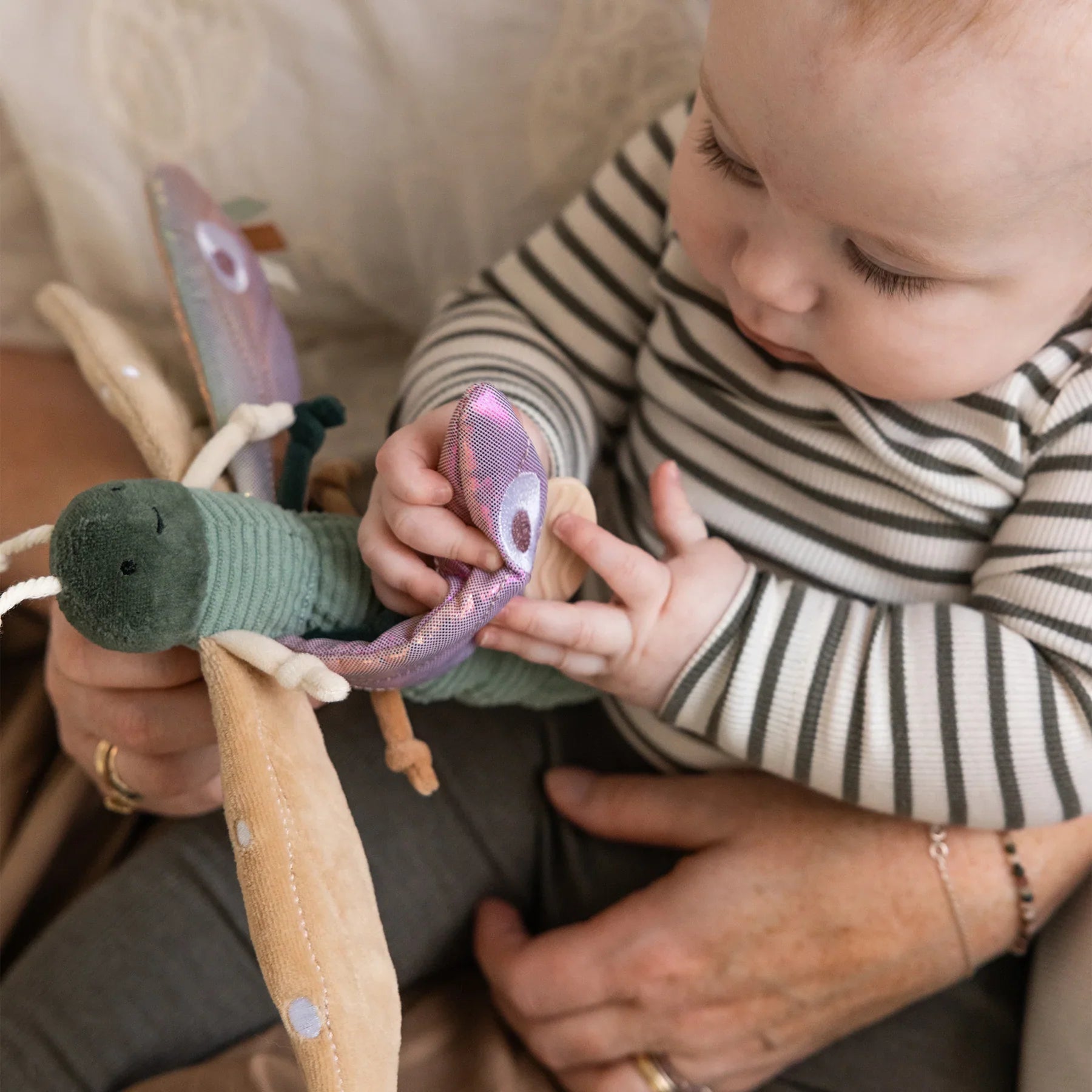 Der Sebra Kinderwagenanhänger in Form einer weichen, rasselnden Libelle ist ein einzigartiges sensorisches Spielzeug, das Babys Aufmerksamkeit von den ersten Momenten an fesselt und sie dazu ermutigt, die Welt zu erkunden.