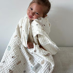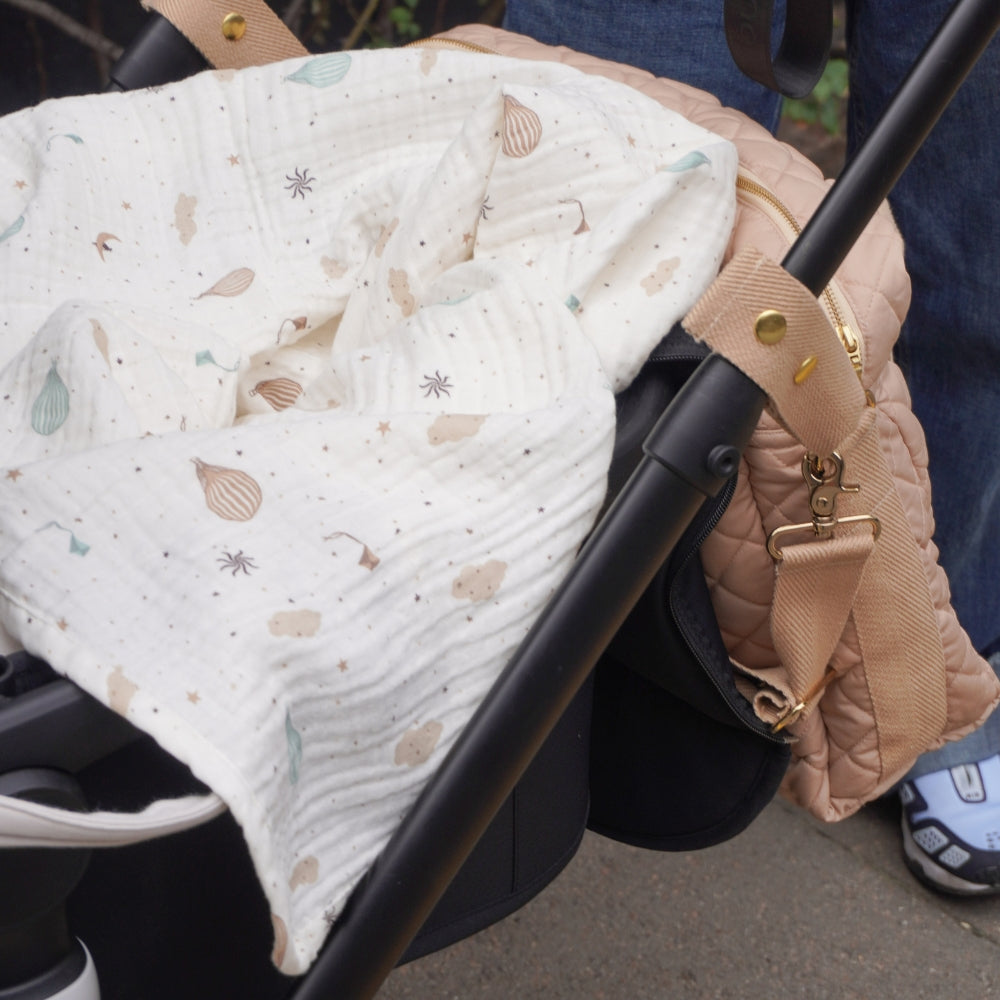 Der zarte Musselin-Stoff, der für seine außergewöhnliche Leichtigkeit und angenehme Textur bekannt ist, macht die Decke perfekt zum Kuscheln mit dem Baby, zum Zudecken im Kinderwagen bei Spaziergängen oder als dekoratives Accessoire im Babyzimmer.