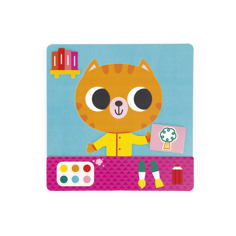Das Set besteht aus einer Tafel mit einer niedlichen roten Katze und 30 Magneten, auf denen ihre Kleidung, Mahlzeiten, Haushaltsgegenstände und Accessoires abgebildet sind.
