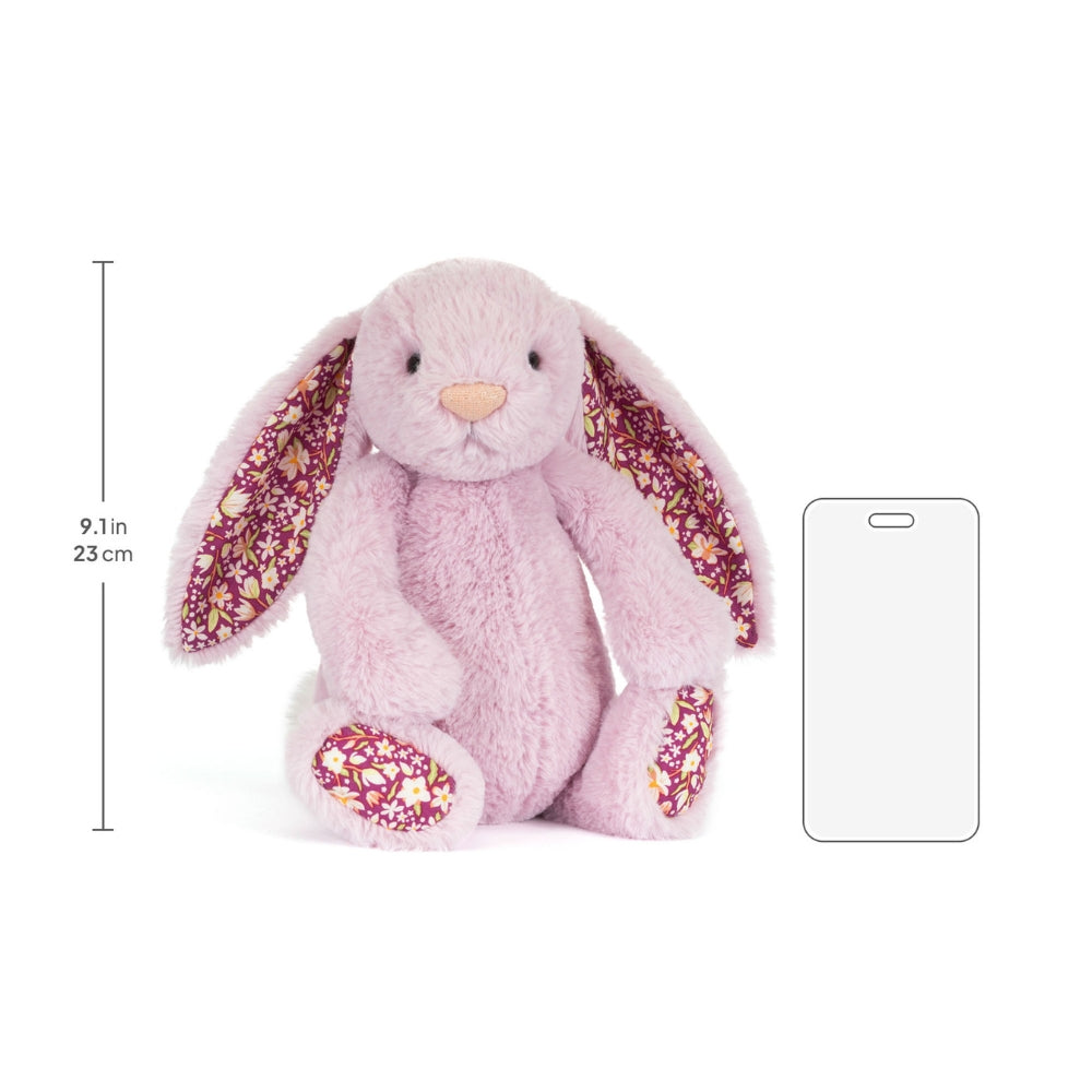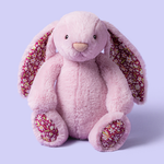 Das Blushkin Blossom Luxe Bunny Kuscheltier von Jellycat ist ein bezauberndes fliederfarbenes Häschen mit geblümten Ohren, das sofort zum Kuscheln animiert.