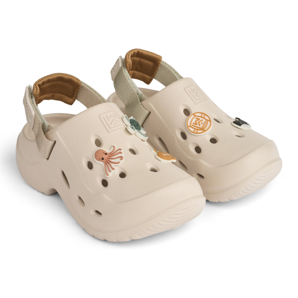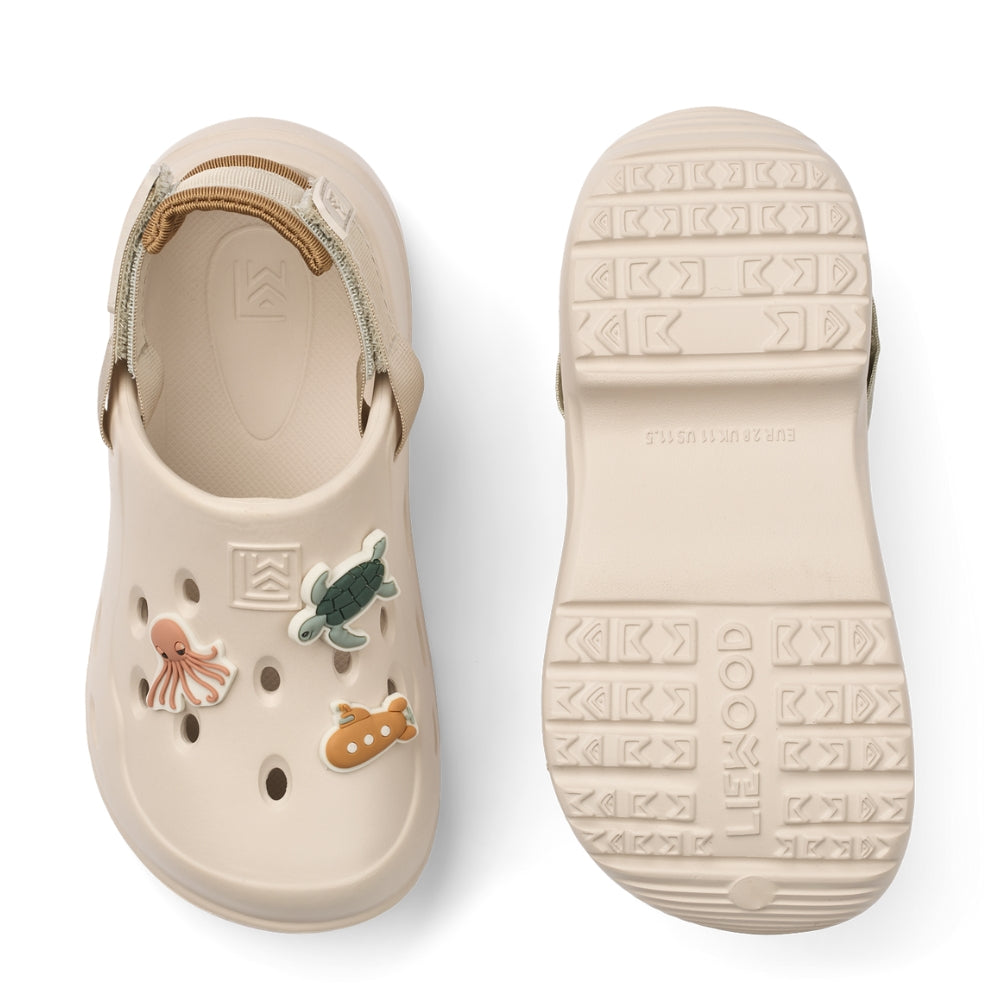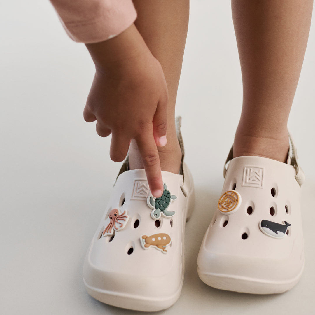 Das Modell ist mit lustigen, farbenfrohen Anhängern in den charakteristischen Liewood-Formen der Marke versehen, die neu arrangiert und an den Stil der Kinder angepasst werden können. Der verstellbare Fersenriemen sorgt für eine optimale Passform, während die weiche, gepolsterte Einlegesohle im Fersenbereich für zusätzlichen Komfort sorgt.