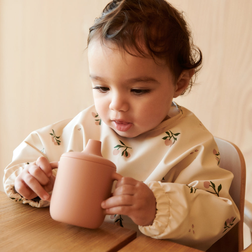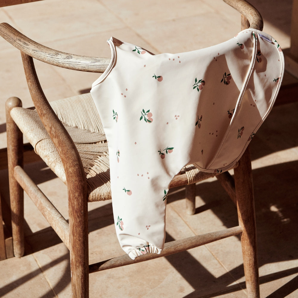 Das Liewood-Lätzchen mit Ärmeln hat ein schönes beigefarbenes Pfirsich-Motiv.