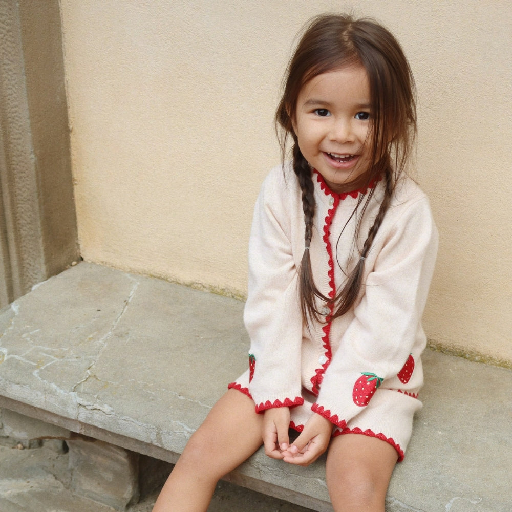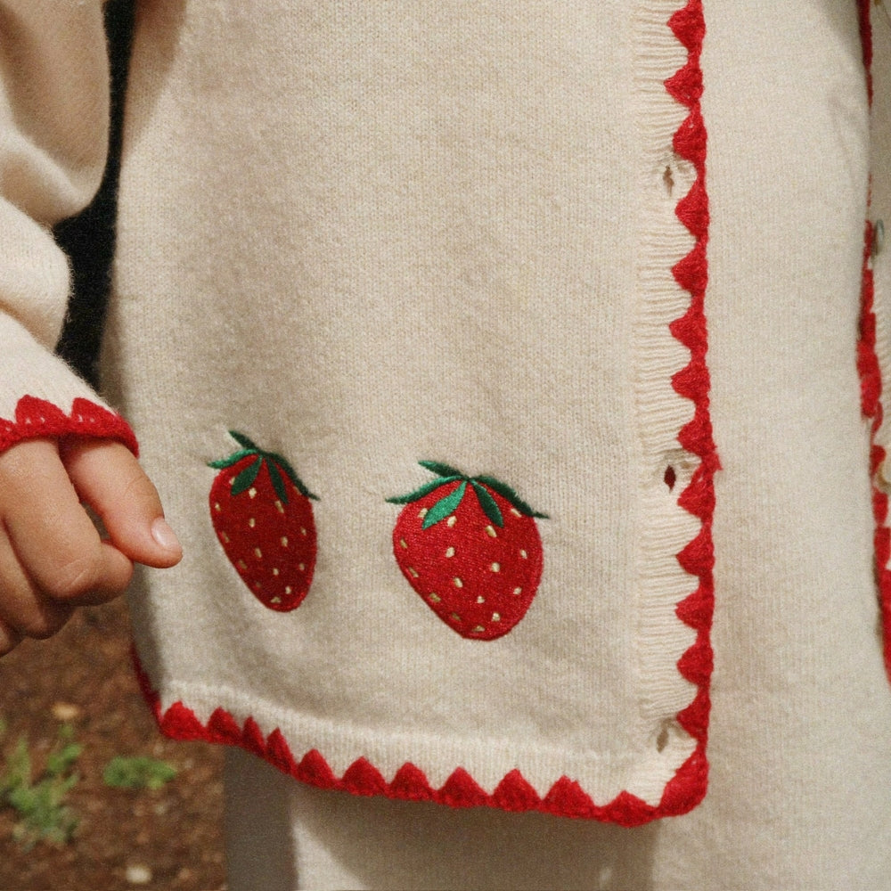 Die dezente Stickerei in Form von Erdbeeren verleiht ihm Charme und eine einzigartige Note, während die gerade, leicht taillierte Silhouette und die praktischen Vordertaschen für Funktionalität sorgen. Das Konges Slojd Kleid für Mädchen wurde für den Alltag entworfen - es ist warm, bequem und dennoch voller mädchenhaftem Charme.