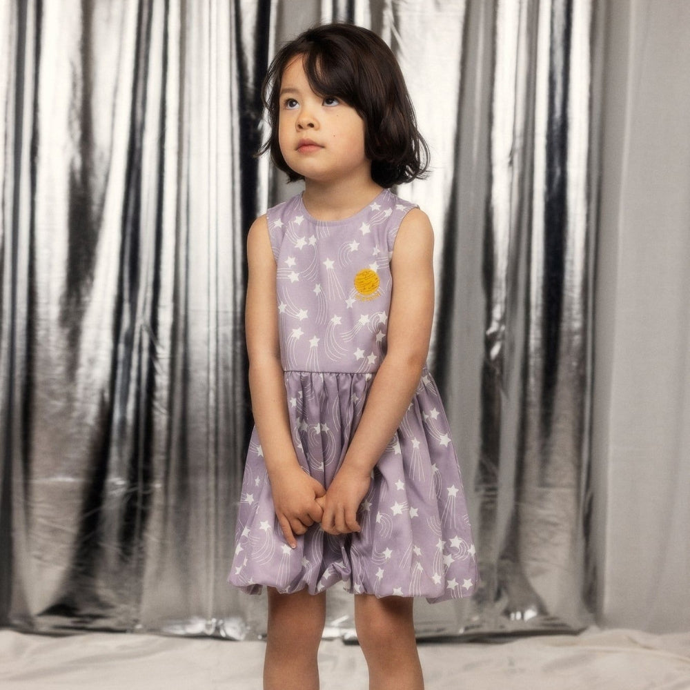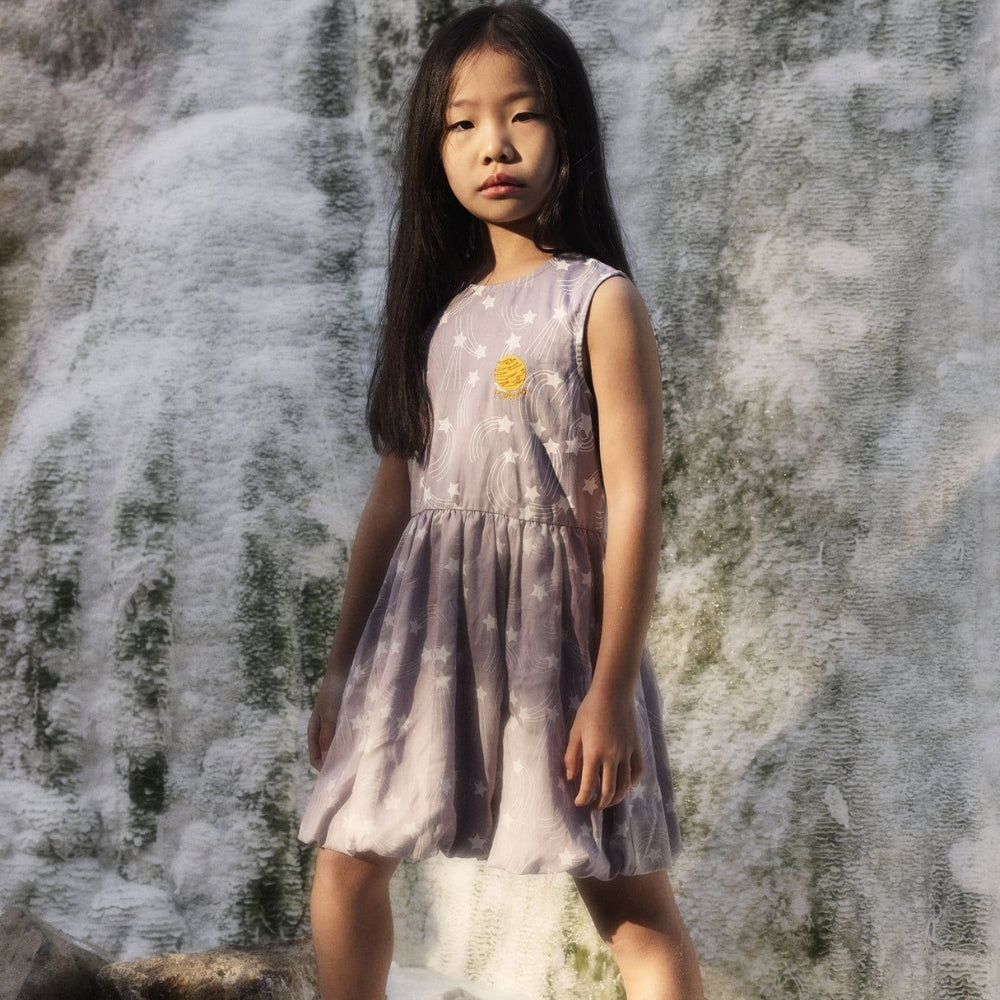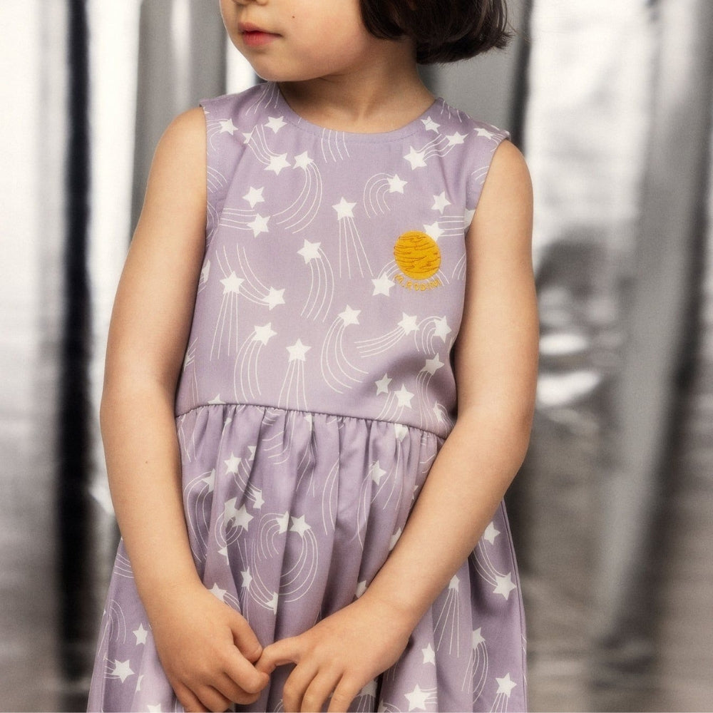 Das Mädchenkleid ist mit einem über den Stoff verteilten Starfall-Print und einem gestickten Planetenaufnäher auf der Brust verziert.