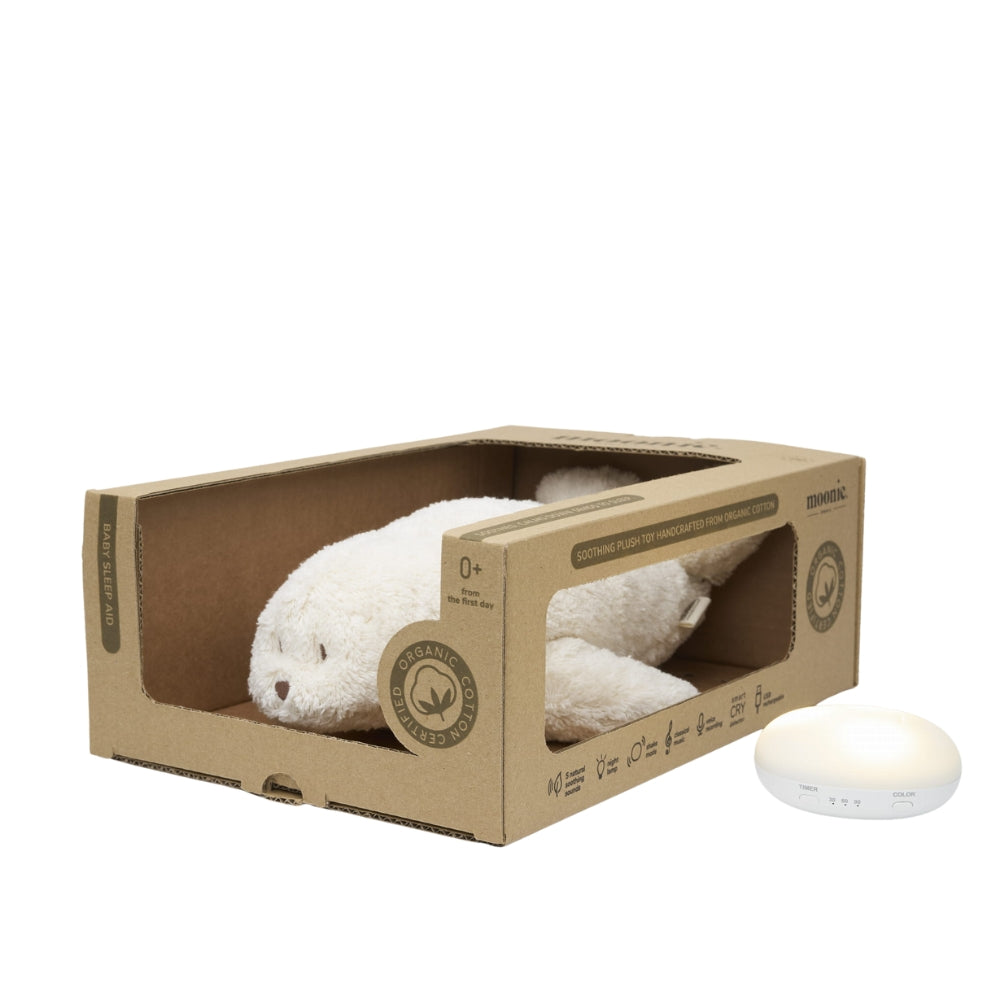 Die kuschelige summende Robbe von Moonie ist eine moderne Einschlafhilfe, die Funktionalität mit sicheren Materialien und einem niedlichen Design verbindet.