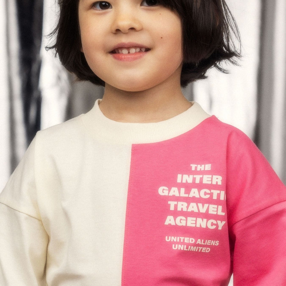 Die zweifarbige Aufteilung zieht die Blicke auf sich und macht das Kinder-T-Shirt zu einem starken Styling-Element.