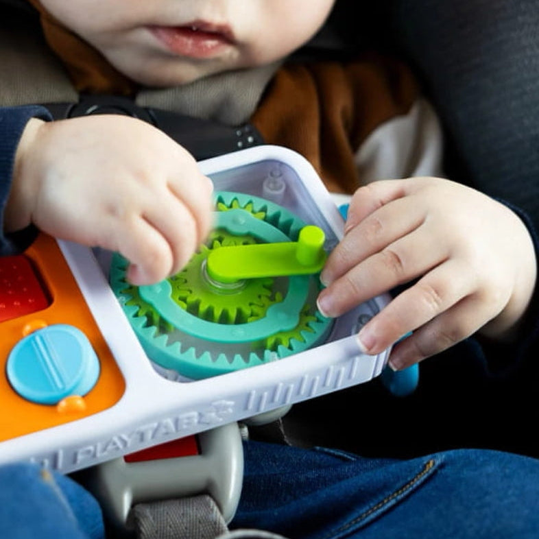 Das Fat Brain Toys PlayTab Sensorik-Quadrat mit Zahnrädern ist ein fesselndes Spielzeug, das Ihr Kind dazu einlädt, Bewegung, Beziehungen und taktile Empfindungen zu erkunden.