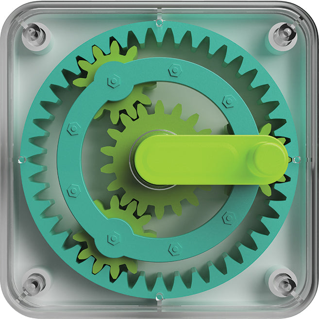 Mit einem durch eine Kurbel aktivierten Mechanismus kann ein Kleinkind beobachten, wie das große Rad die drei kleineren Räder bewegt, was für viel Freude sorgt und zum Experimentieren anregt.