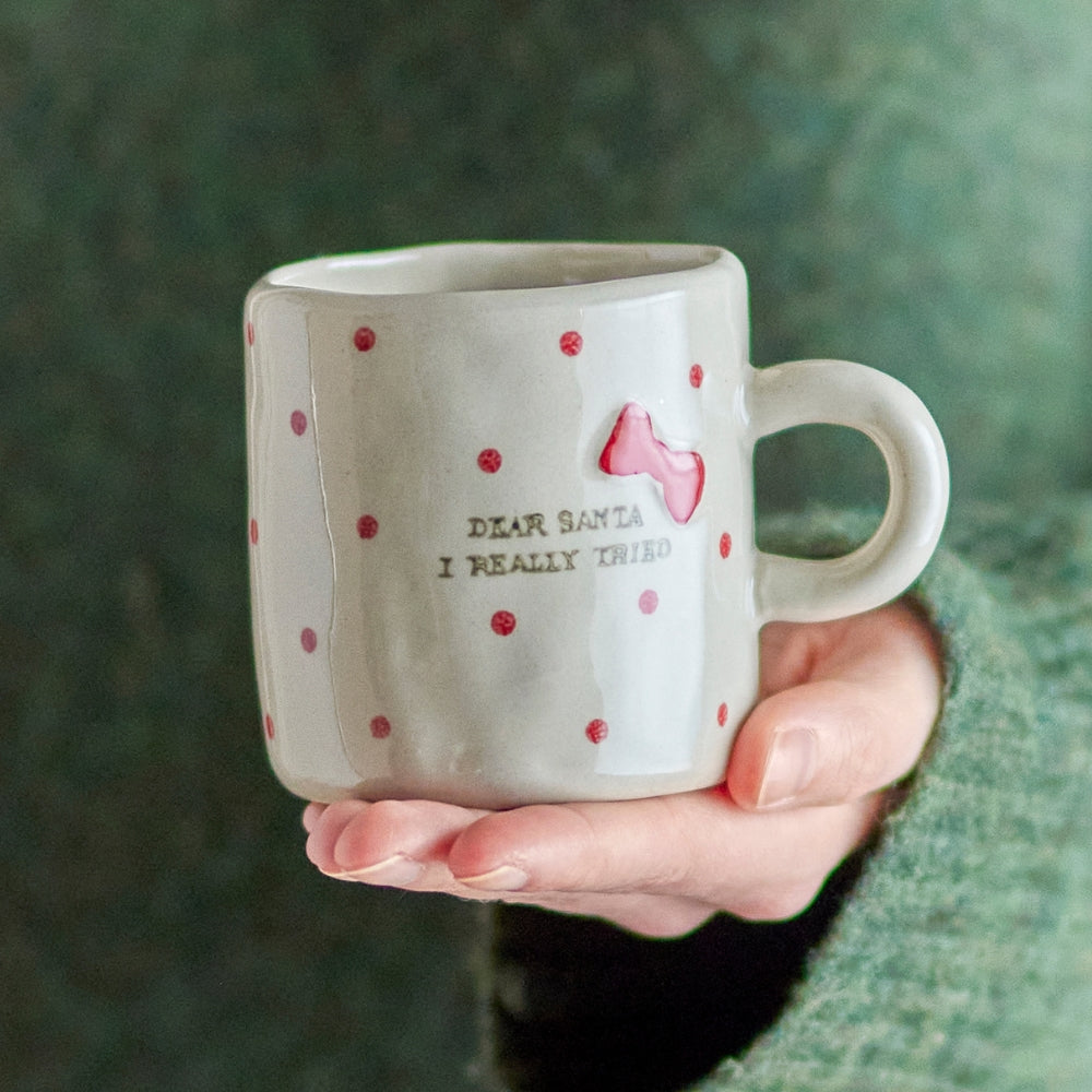 Die charmante Aufschrift "Dear Santa I really tried" und die handgemalten roten Details machen jede Tasse zu einem Unikat.