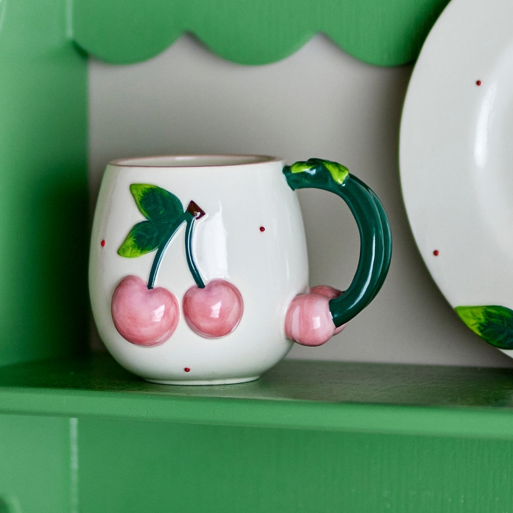 Die einzigartige Steingut-Tasse besticht durch ihre runde Form, die cremefarbene Oberfläche und das handgemalte Motiv aus rosa Kirschen.