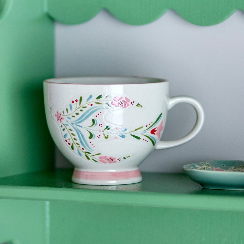 Der sanft ausgestellte Boden und der zart rosafarbene Rand verleihen Leichtigkeit und Eleganz, während die handgemalten Motive von Vögeln, Blumen und Blättern die Blicke auf sich ziehen.