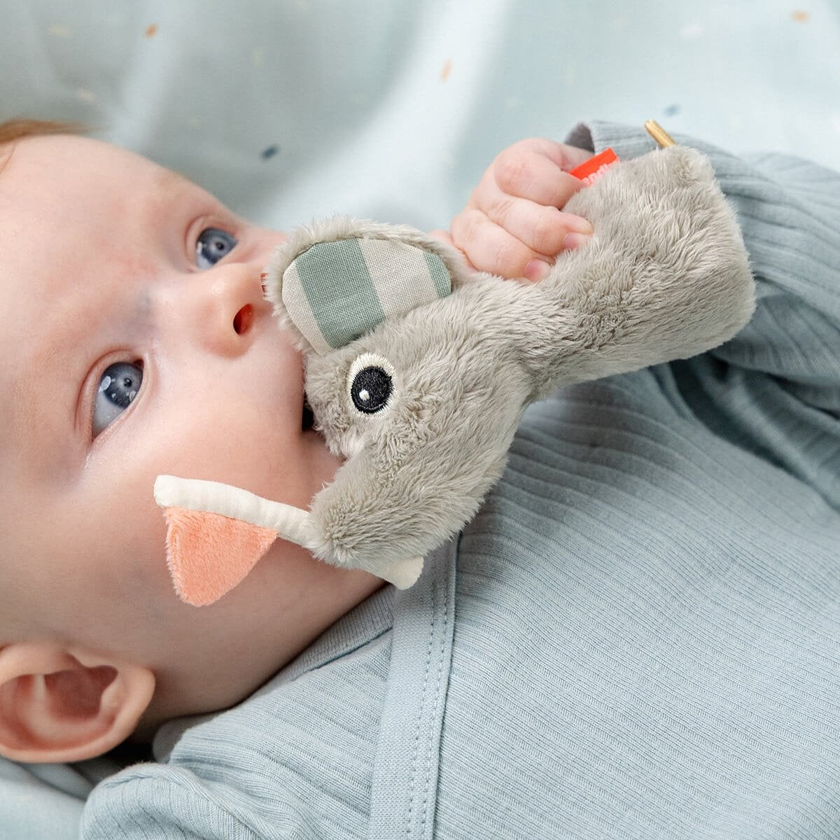 Die elefantenförmige Rassel regt zum Greifen, Schütteln und Erkunden an und kann beim Zahnen Erleichterung verschaffen.
