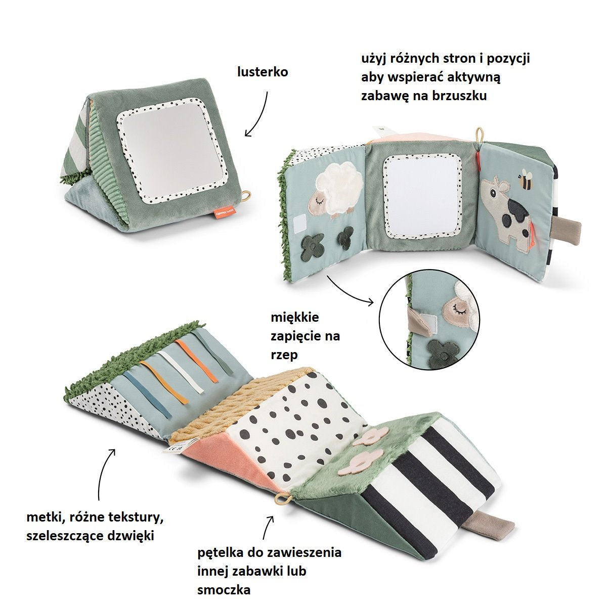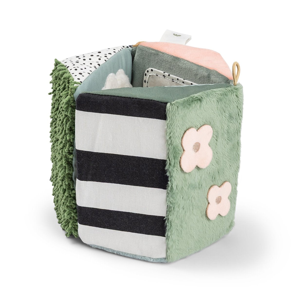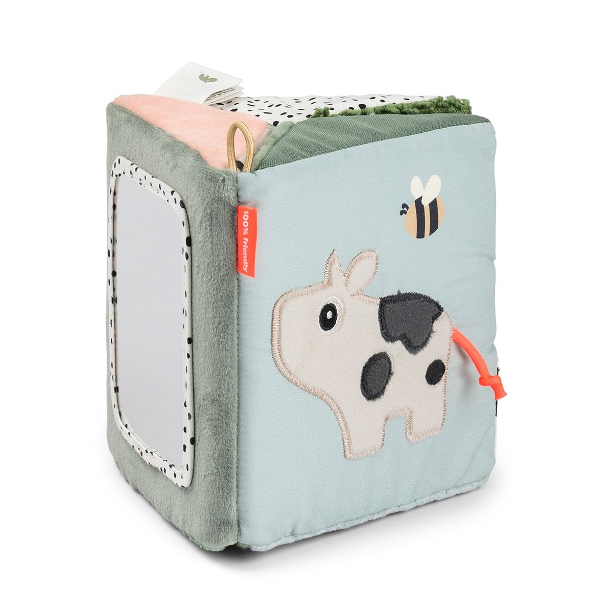 Done by Deer hat sich um jedes Detail gekümmert - von den kontrastierenden Prints über die raschelnden Elemente bis hin zum sicheren Spiegel, der den Sehsinn fördert und für viel Spaß sorgt.