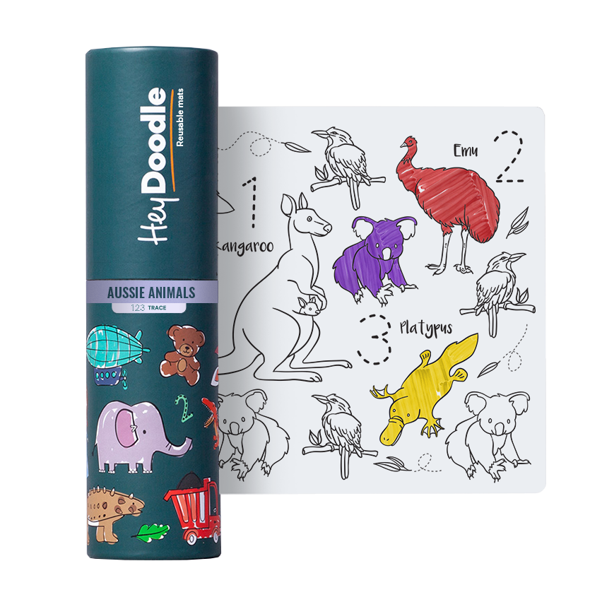 Auf der Silikonoberfläche im A4-Format sind australische Tiere und Zahlen zum Nachzeichnen abgebildet, so dass das Erlernen von Zählen und ersten Zahlen Spaß macht. Die farbigen Illustrationen lassen sich jederzeit mit einem feuchten Tuch abwischen oder unter Wasser abspülen und wiederverwenden.