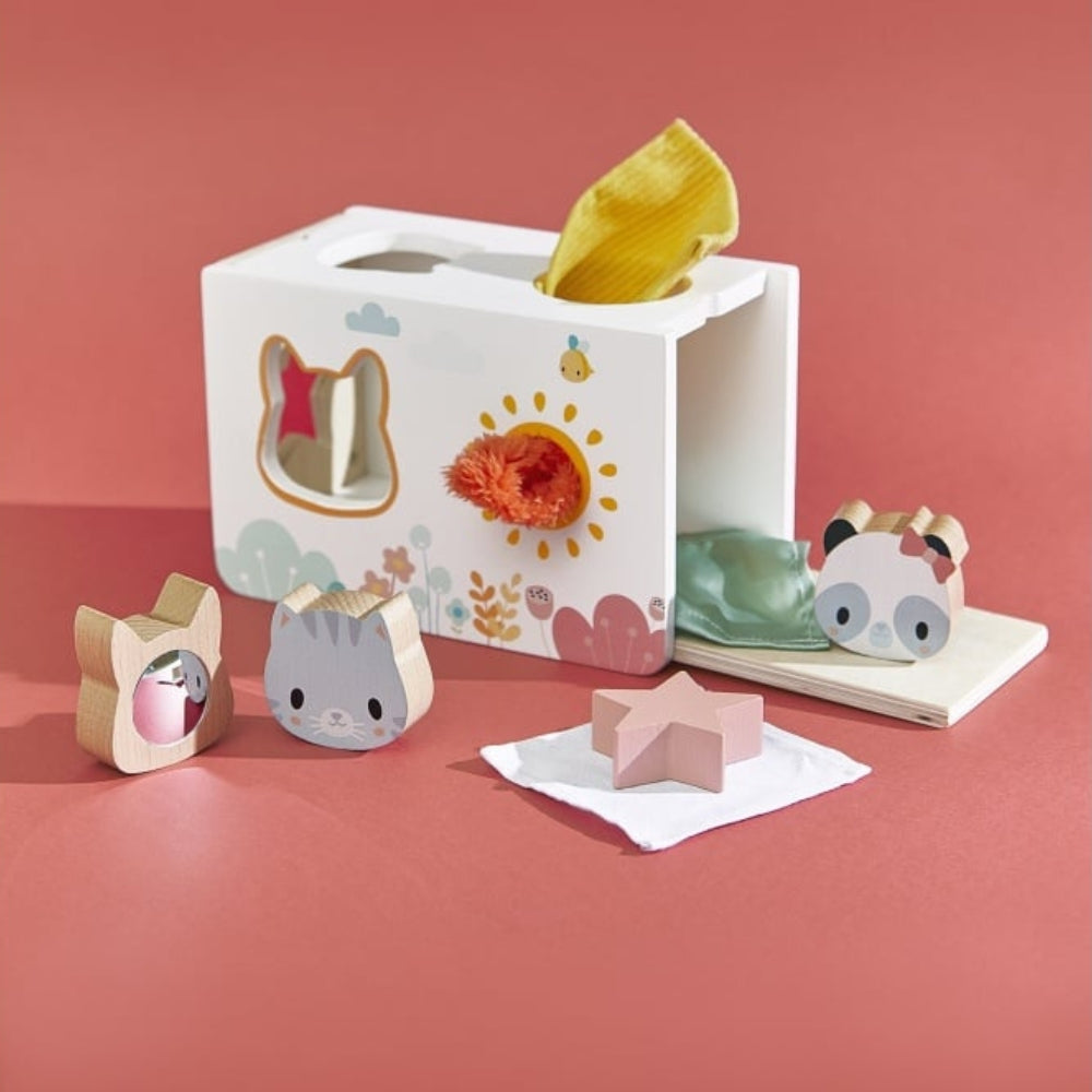 Janod Holz Sortierer sensorische Box mit Tüchern Rein