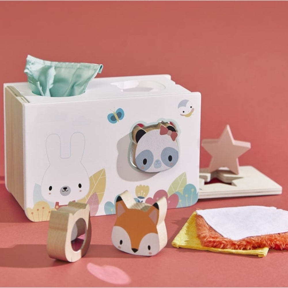 Das Janod-Set enthält vier Holzteile zum Sortieren: drei Tierköpfe - einen Panda, eine Katze und einen Fuchs - und einen Stern sowie vier weiche Stofftücher" mit unterschiedlichen Strukturen.
