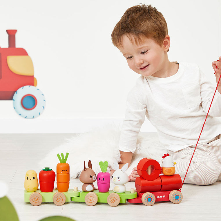 Janod Kindereisenbahn aus Holz mit Klötzen und Figuren zum Ziehen Bauernhof