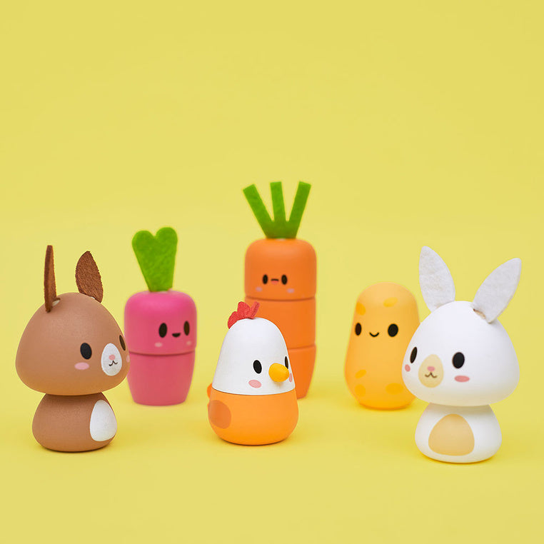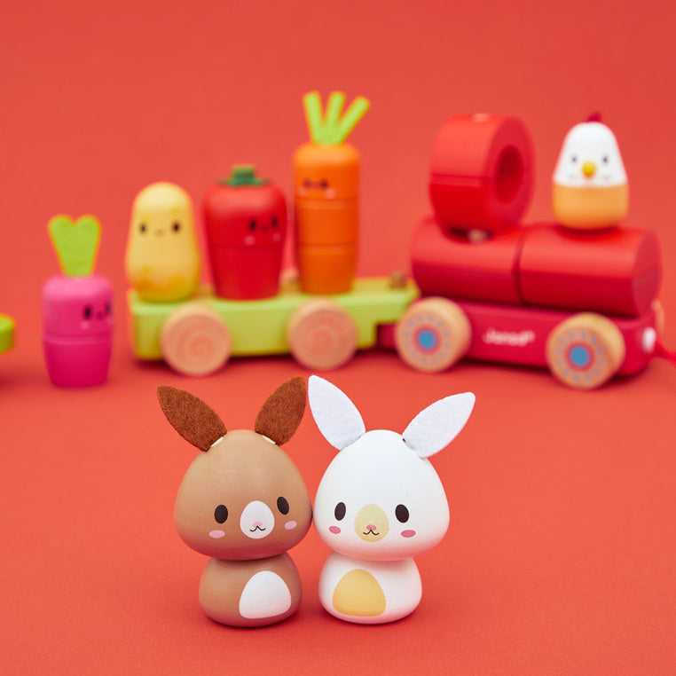 Das Set besteht aus drei Waggons mit Stangen und bis zu 19 bunten Teilen zum Zusammenstecken - darunter Teile einer Lokomotive, Hühner, Hasen, Gemüse wie eine Kartoffel, Tomate, Rote Bete oder eine mehrteilige Karotte.