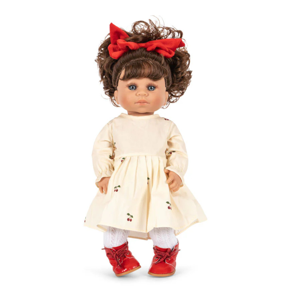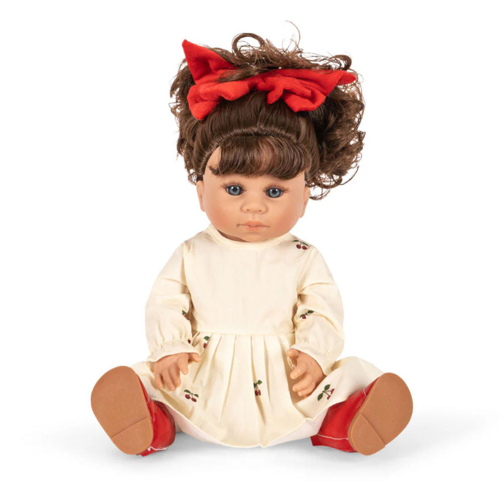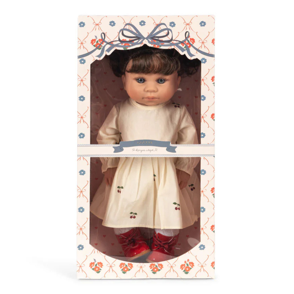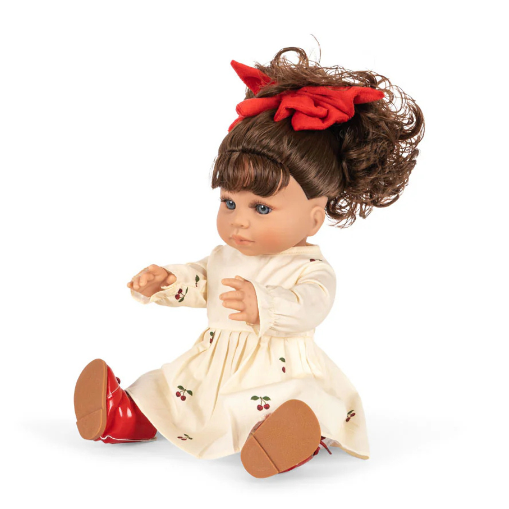 Gekleidet in ein Kleid mit süßem Kirschenmuster und ausgestattet mit langen Haaren, regt sie dazu an, eigene Geschichten und tägliche Pflegerituale zu erfinden.