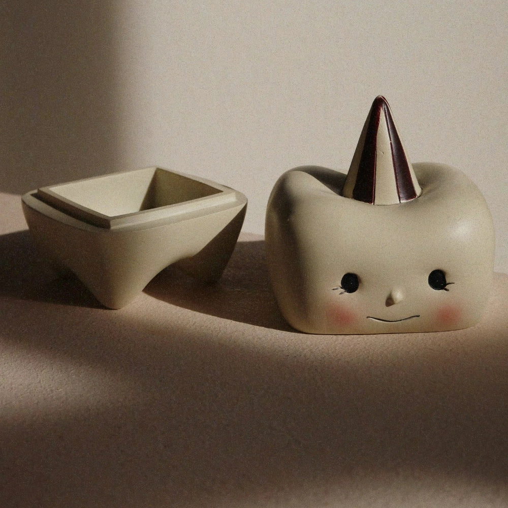 Die Konges Slojd-Zahndose hat die Form einer freundlichen Zahnfee mit zarten Gesichtszügen und gedeckten Farben, die sie zu einer schönen Dekoration für das Kinderzimmer macht. Sie ist aus haltbarem Steinmaterial gefertigt und besticht durch ihre Qualität und Liebe zum Detail. Die Marke Konges Slojd ist bekannt für Produkte, die skandinavischen Minimalismus mit der Wärme und dem Charme der Kinderwelt verbinden.
