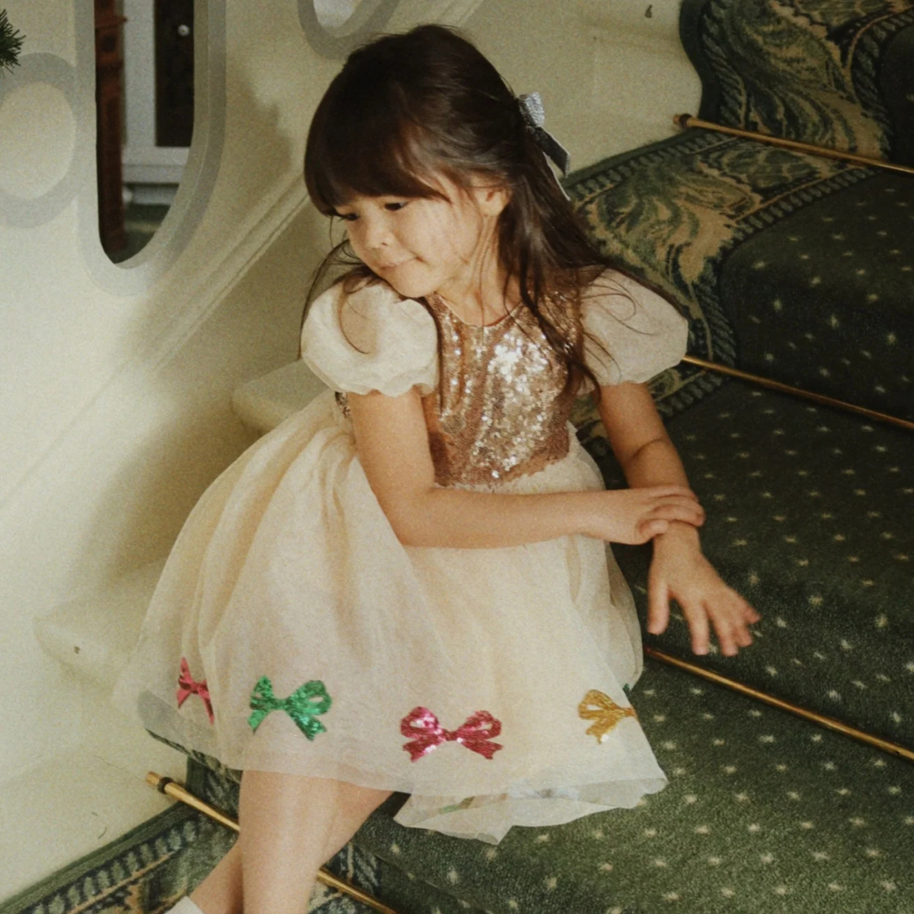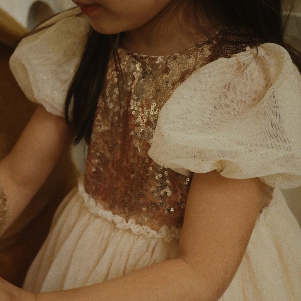 Dieses elegante Design kombiniert glamourösen Schimmer mit einem leichten, märchenhaften Unterteil - perfekt für Feiern, Ferien und Familienfotos.