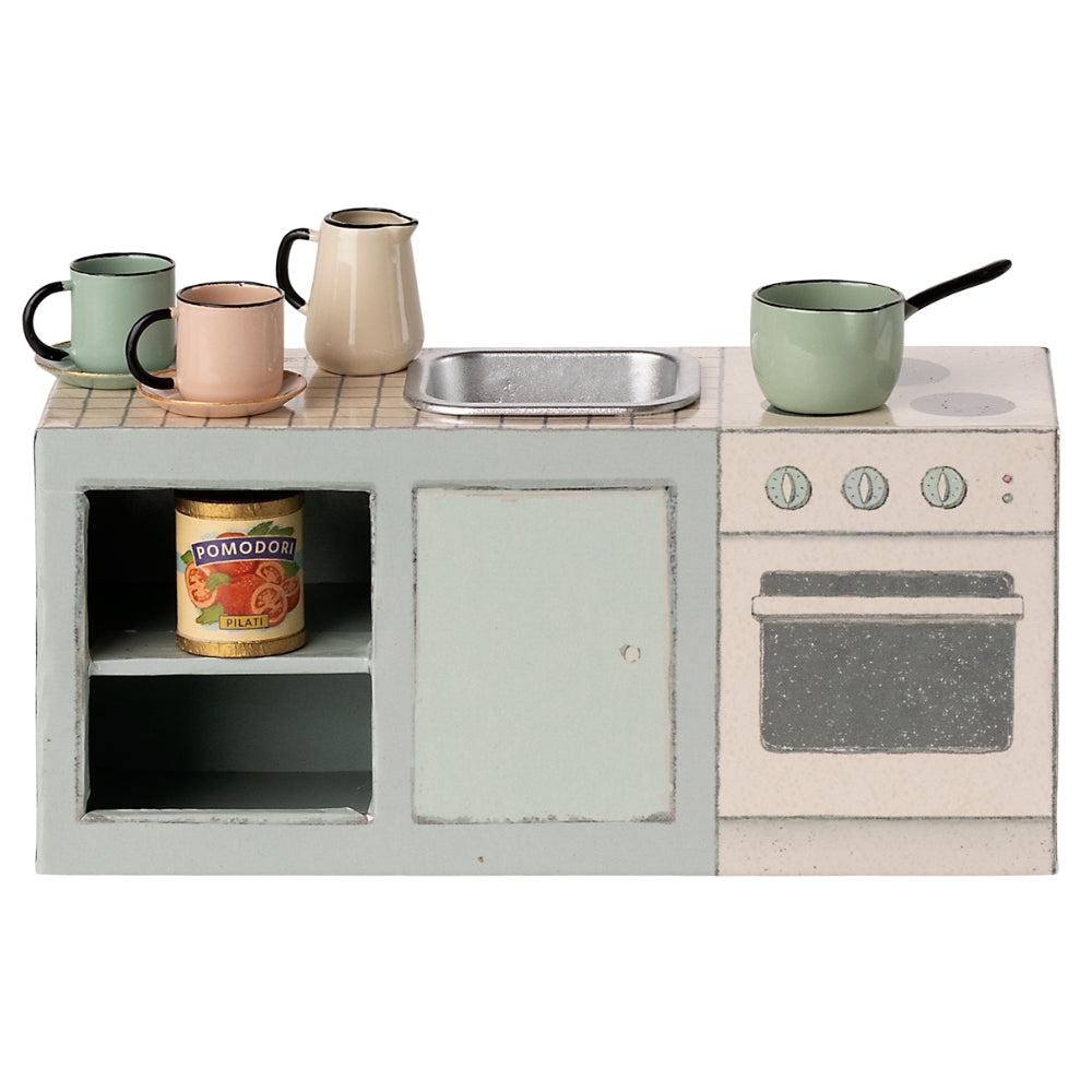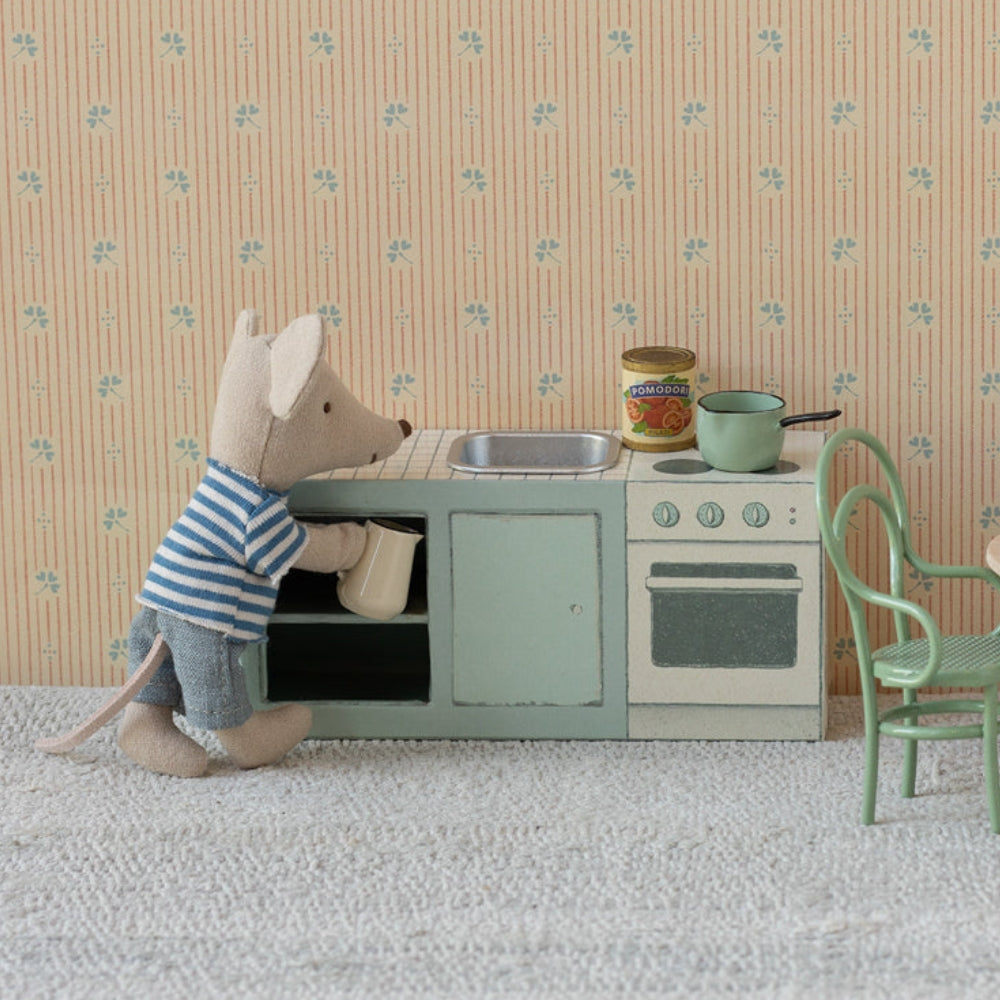 Die Miniatur-Tischplatte verfügt außerdem über eine Metallspüle, die wie eine echte aussieht, was die Fantasie weiter anregt und das Spiel noch interessanter macht. Die Marke Maileg ist bekannt für ihre Liebe zum Detail. Jedes Teil dieses Sets wurde so entworfen, dass es perfekt in die SuitCasa-Maushausküche passt.