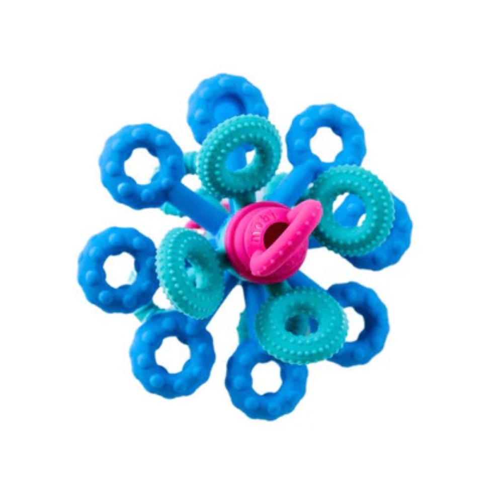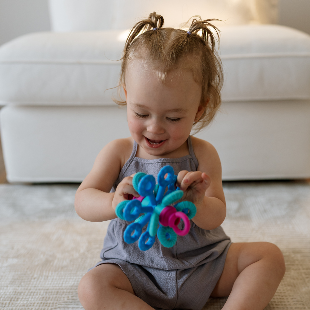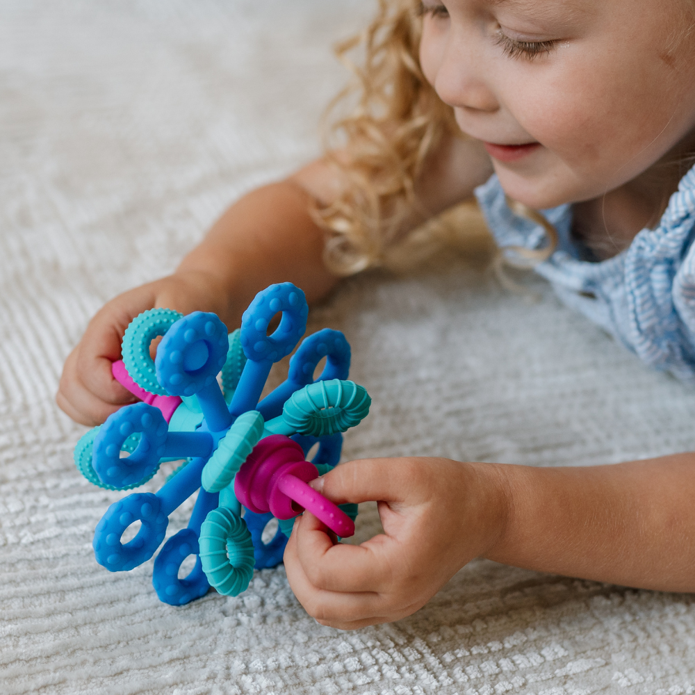 Dieses sensorische Spielzeug verbindet attraktive Form mit Funktionalität - das weiche Silikon fühlt sich angenehm an und die interaktiven Elemente fördern die Selbstentdeckung.