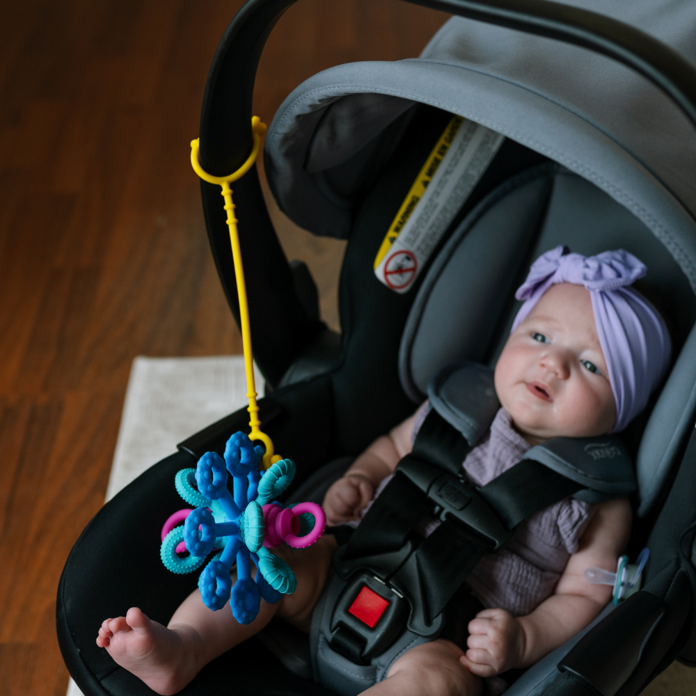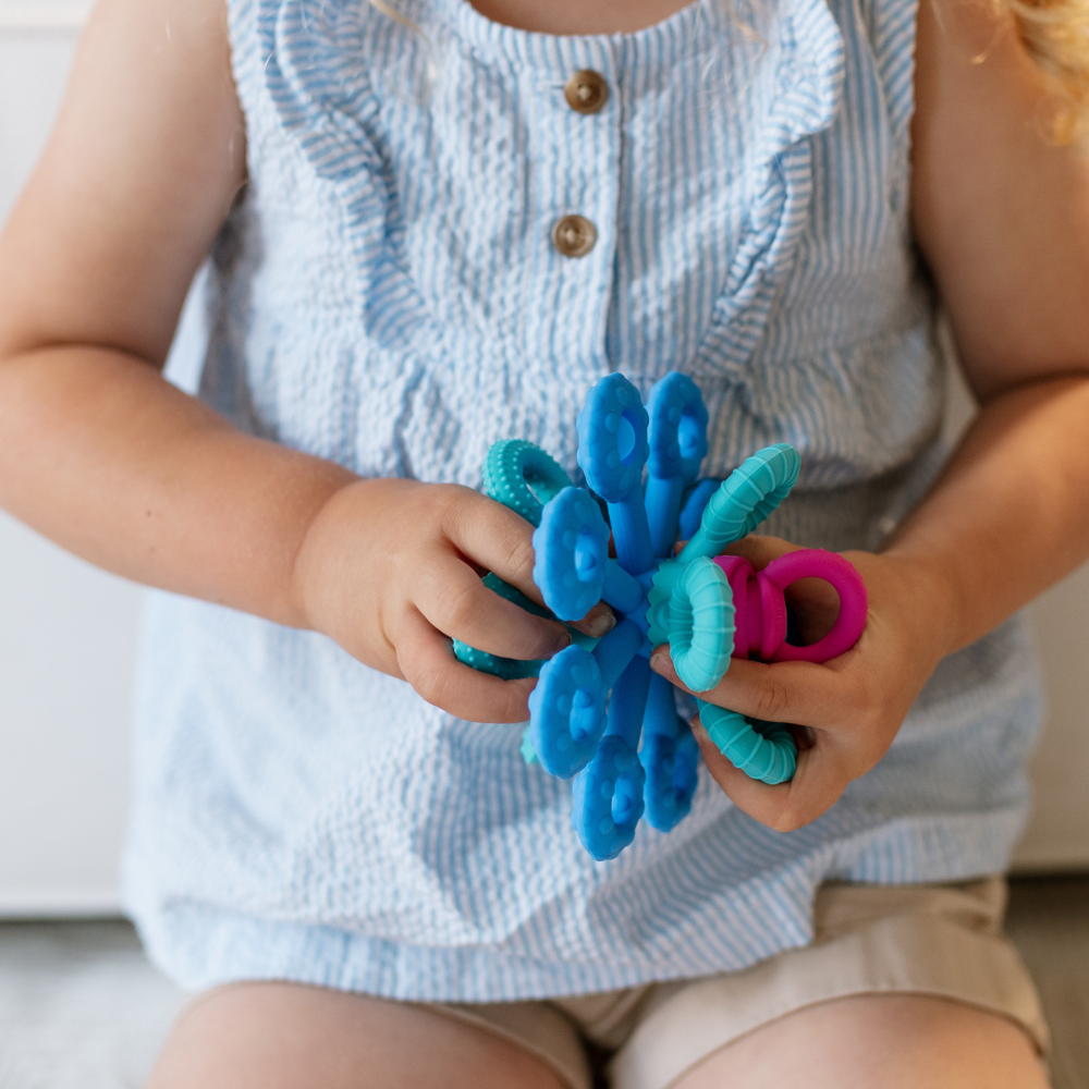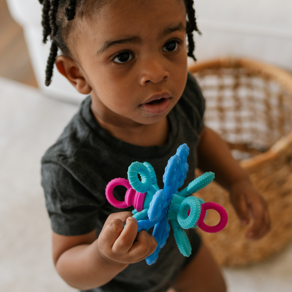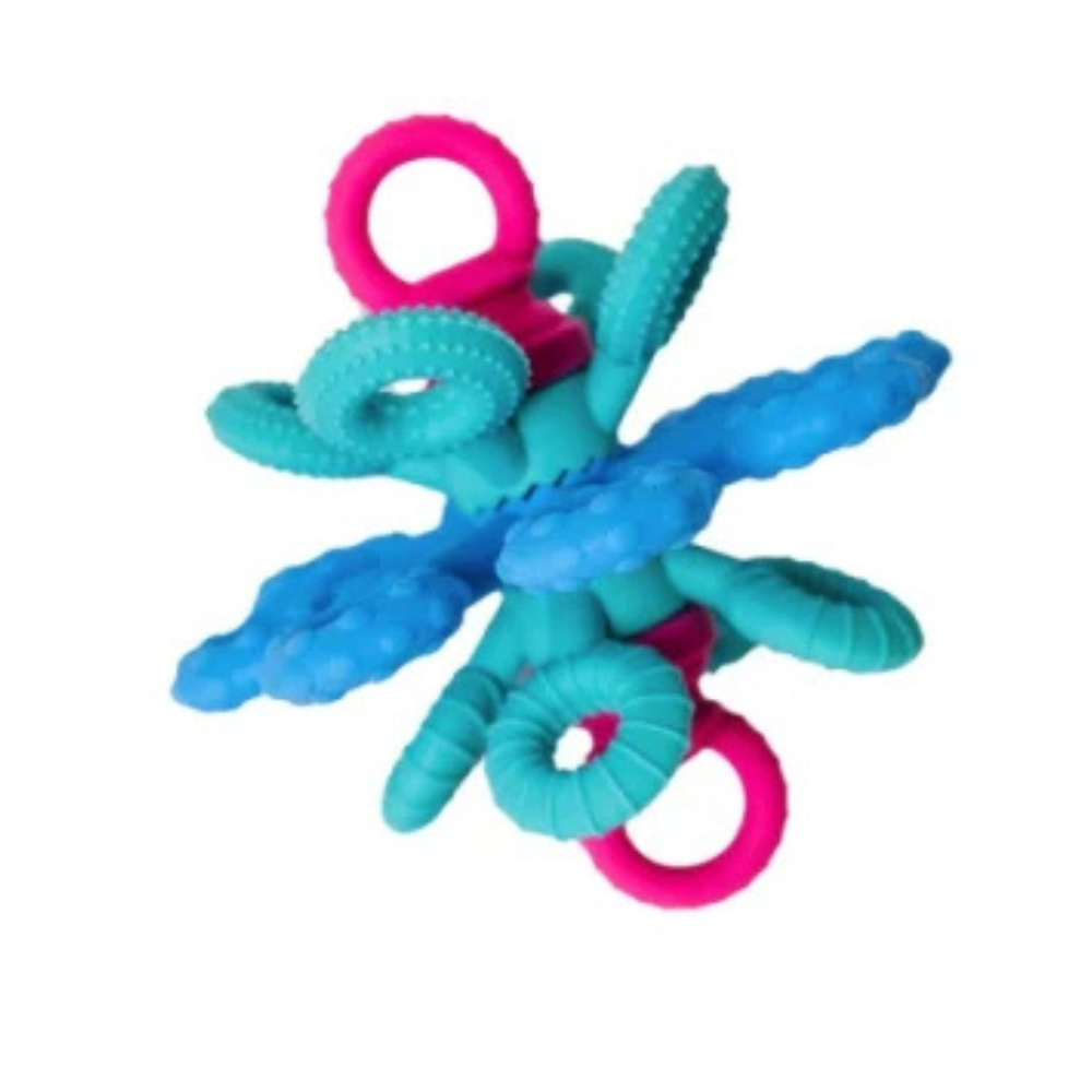 Dieses sensorische Spielzeug verbindet attraktive Form mit Funktionalität - das weiche Silikon fühlt sich angenehm an und die interaktiven Elemente fördern die Selbstentdeckung.