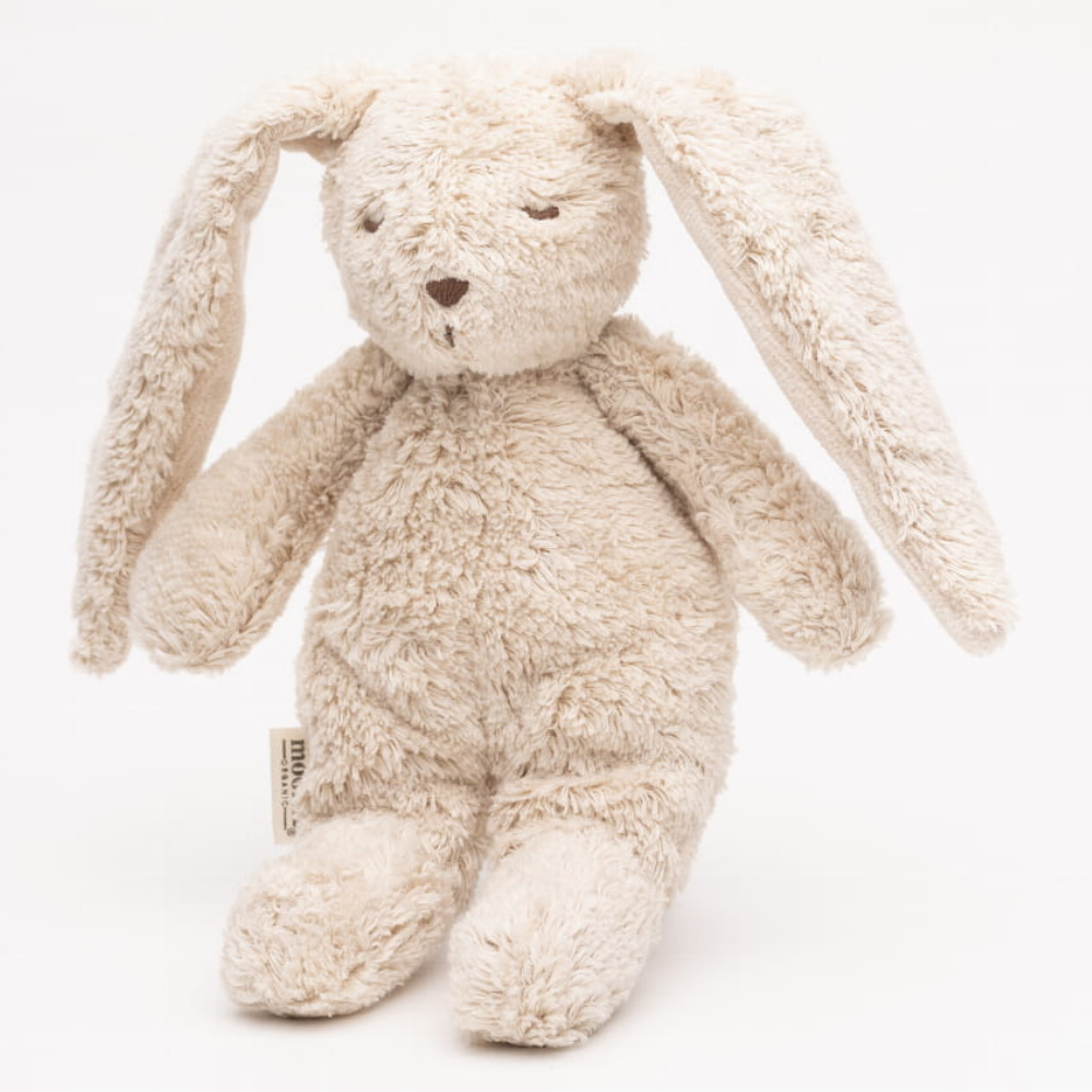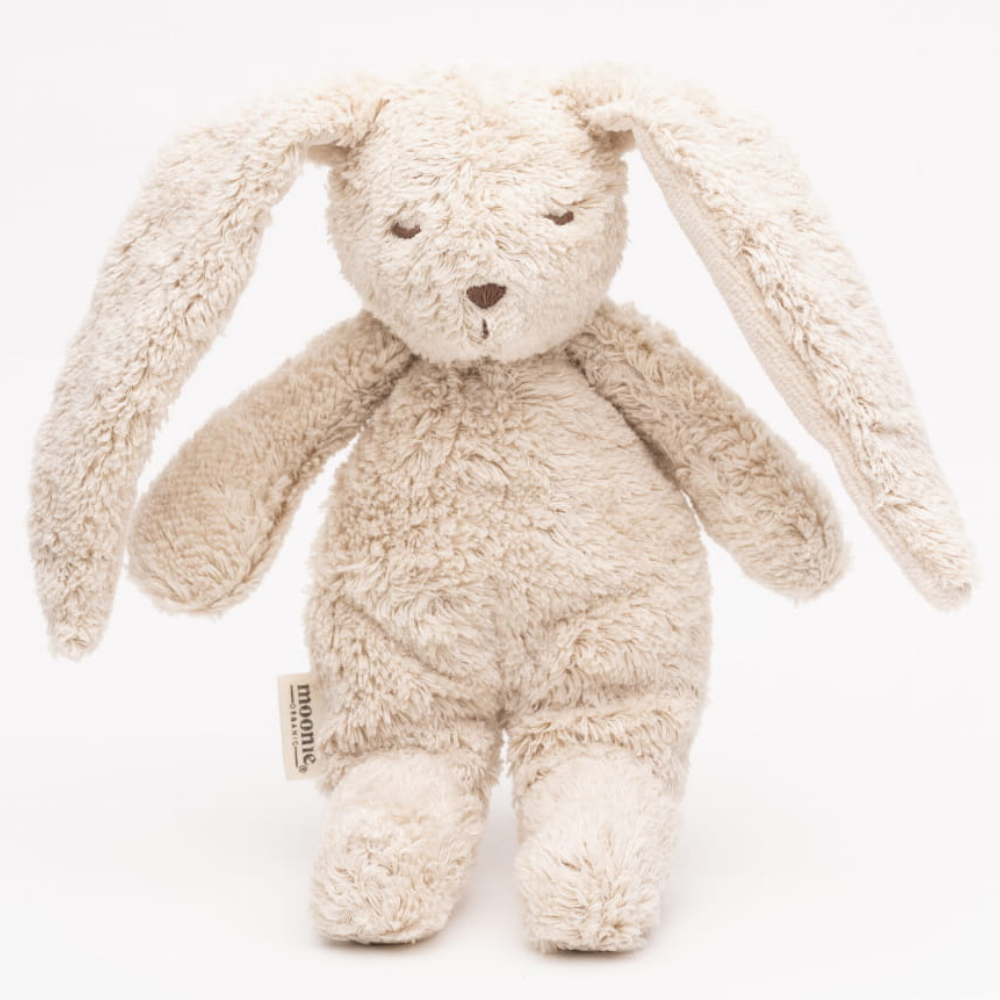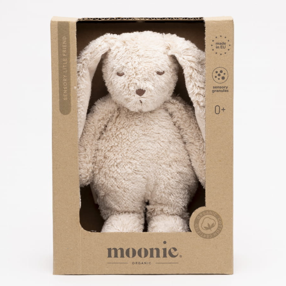 Die Marke Moonie hat hier sichere, taktile Materialien verwendet - Bio-Baumwolle und weiche Füllung -, so dass das Spielzeug auch für Babys empfindliche Haut geeignet ist.