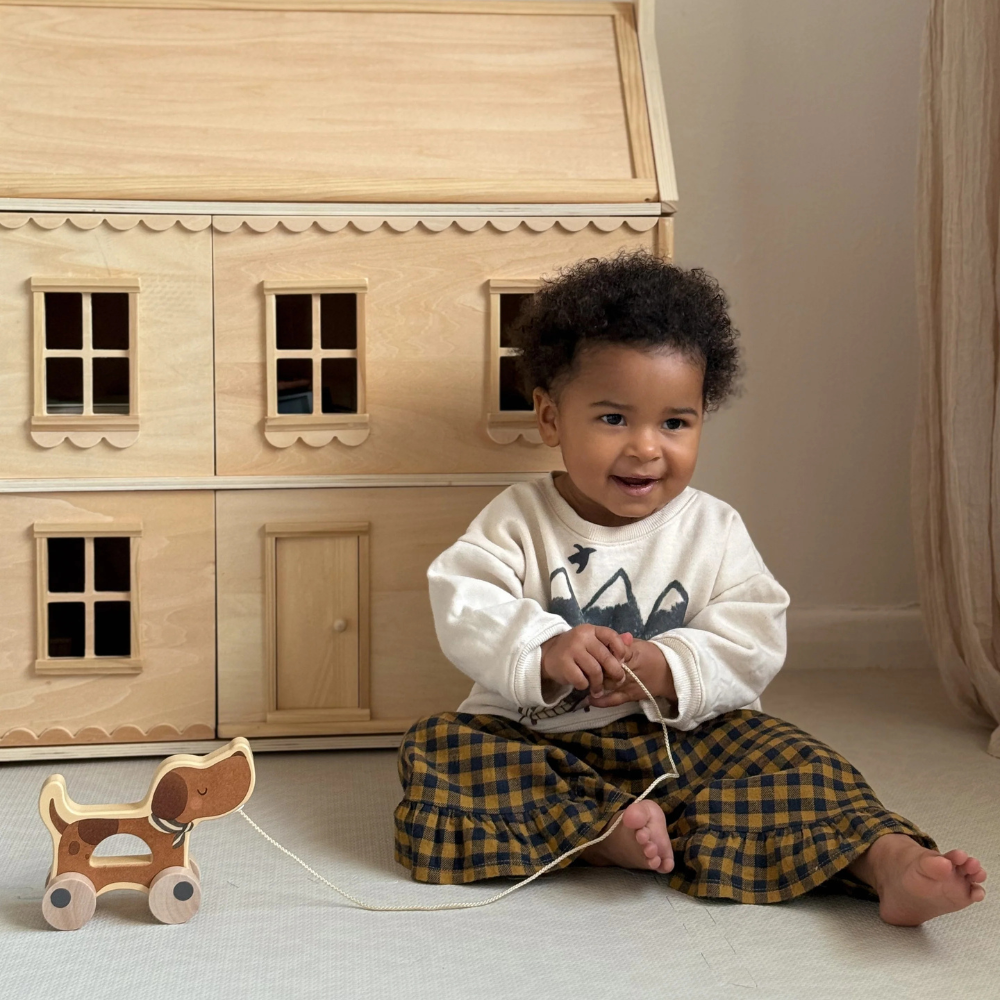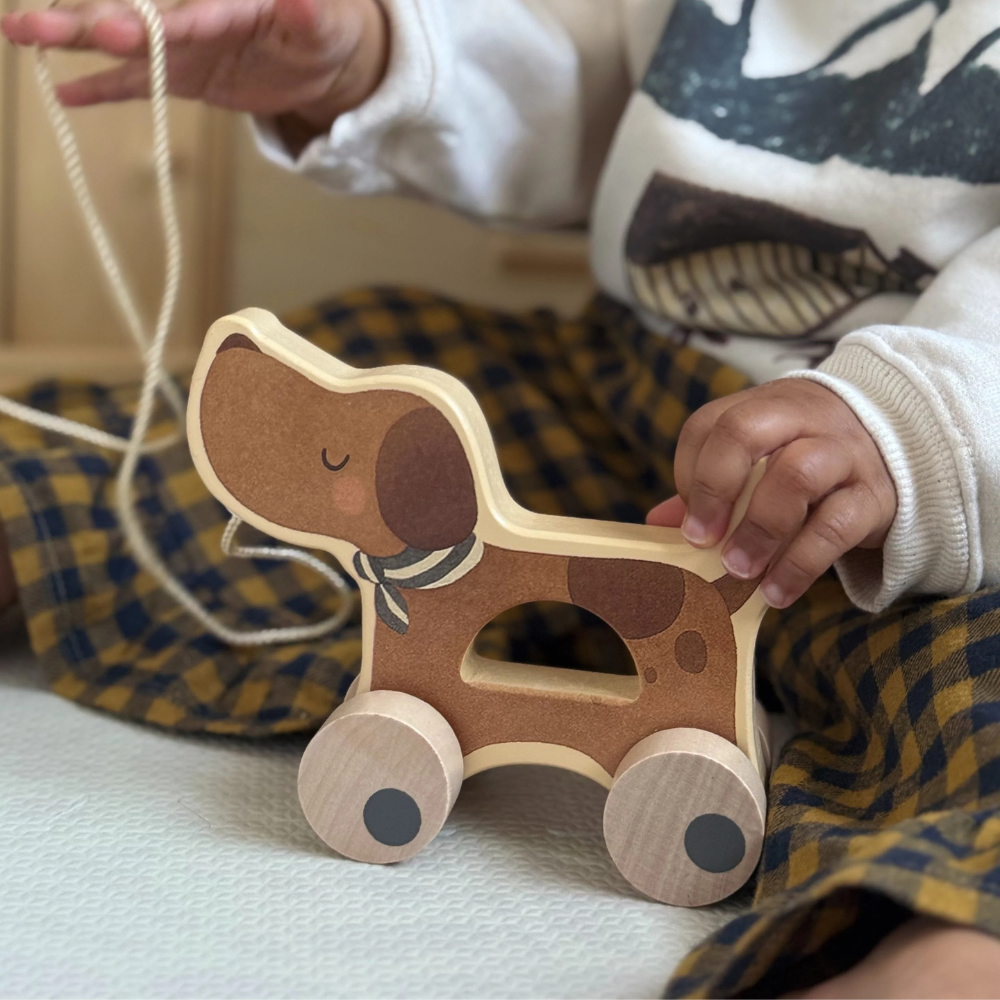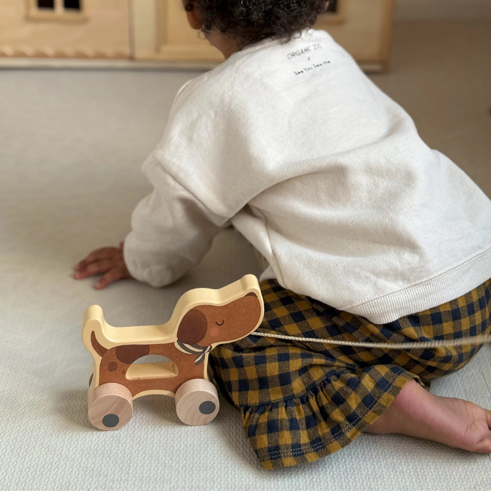 Der Holzhund mit Rädern von Frau Ertha ist ein niedlicher Begleiter für die ersten Spaziergänge und die täglichen Abenteuer.