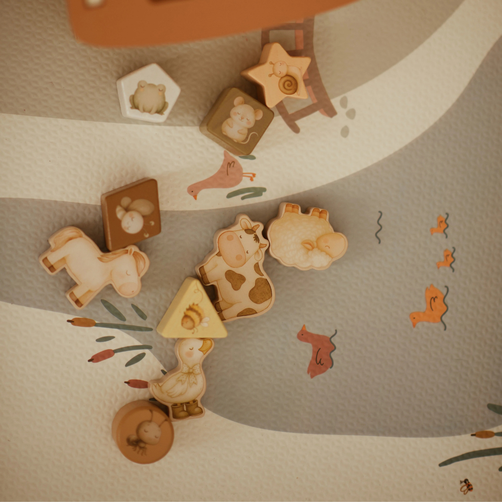 Das Set von Frau Ertha enthält 13 Teile in Form von Tieren und Gegenständen vom Bauernhof, die angeordnet und bewegt werden können und ihre eigenen Geschichten erzählen - ideal, um Konzentration und Vorstellungskraft zu trainieren.