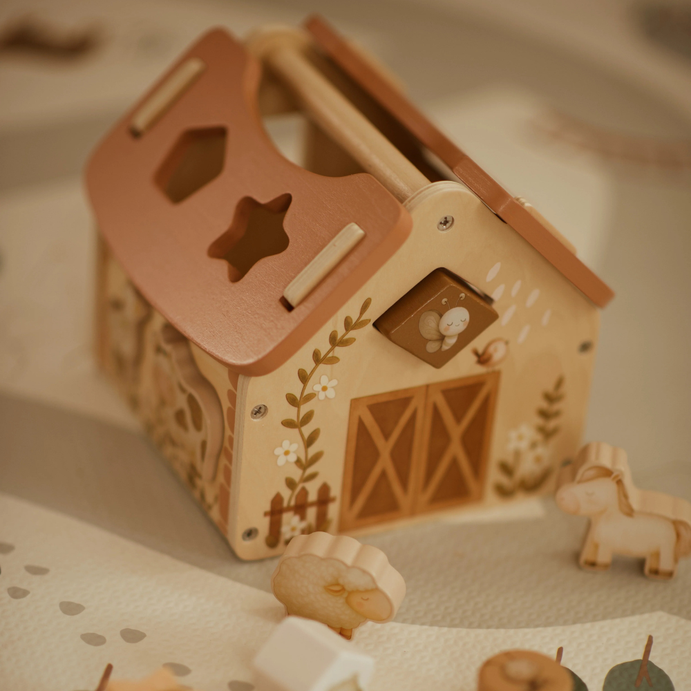 Diese Holzscheune fördert ein entspanntes, montessorianisches Spiel: keine blinkenden Reize, sondern natürliche Materialien und ein einfacher Mechanismus des "Ausprobierens und Entdeckens".