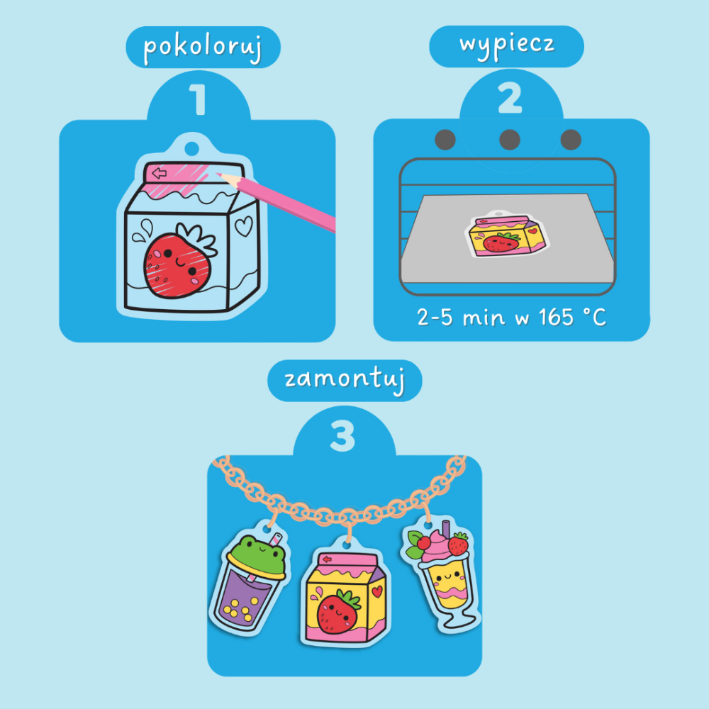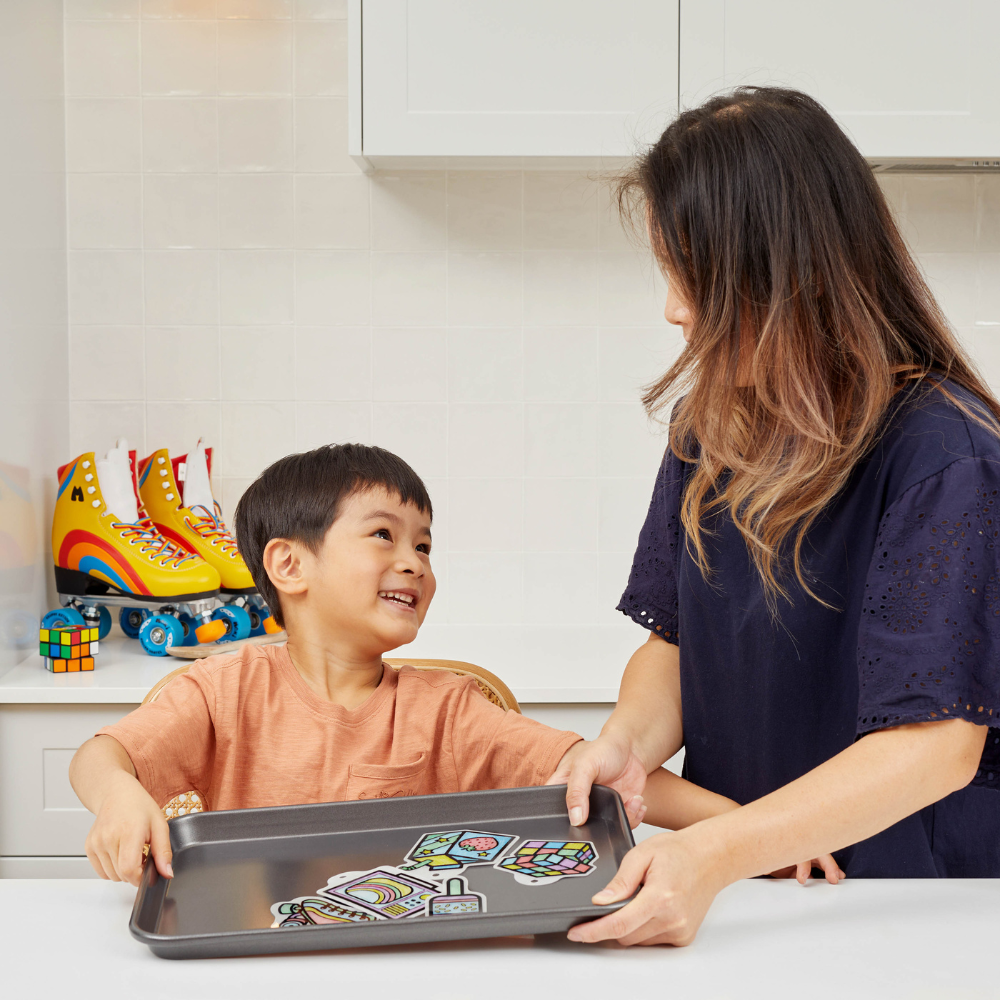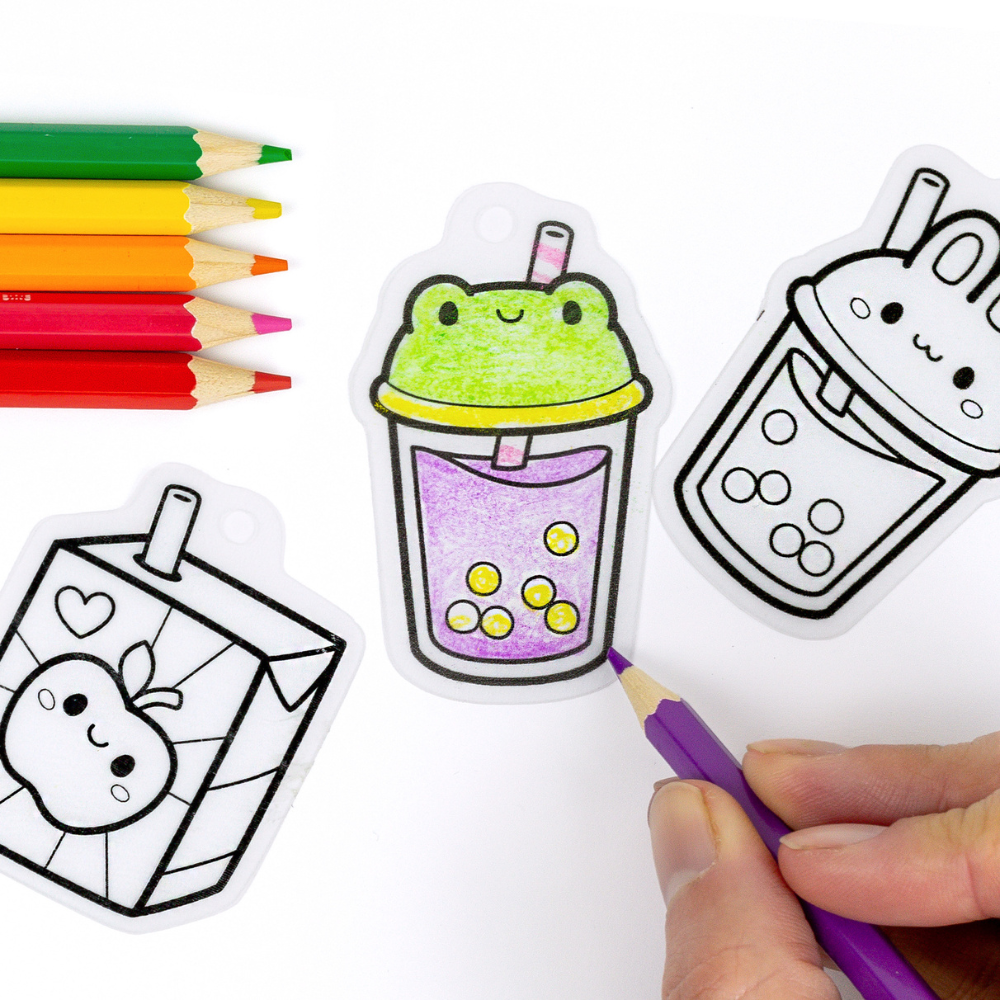 Alles, was sie tun müssen, ist, die illustrierten, vorgeschnittenen Motive auszumalen, sie in den Ofen zu legen und zu beobachten, wie sie auf etwa 40 % ihrer ursprünglichen Größe schrumpfen und die Farben intensiver werden - echte Magie für zu Hause.